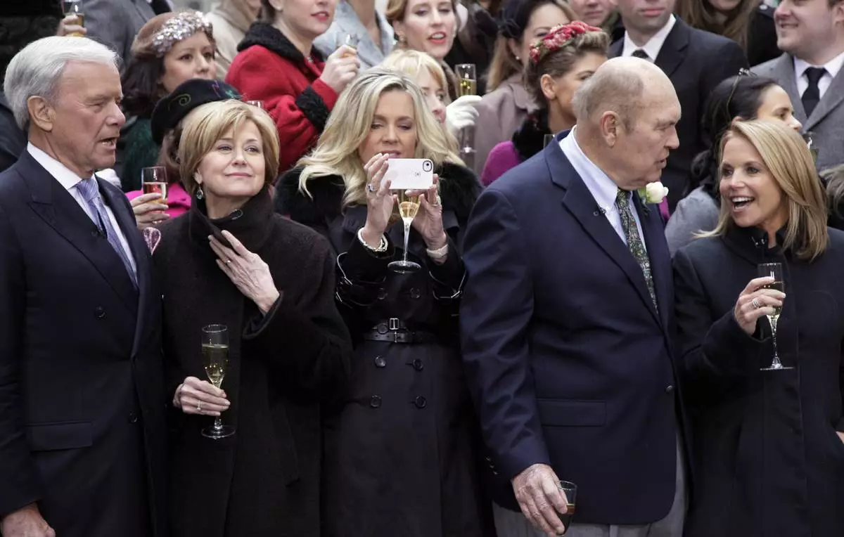 FILE - Former NBC "Today" television program hosts Tom Brokaw, left, Jane Pauley, second left, Deborah Norville, center, and Katie Couric, right, with veteran weatherman Willard Scott, gather for a toast in New York's Rockefeller Center, Jan. 13, 2012. (AP Photo/Richard Drew, File)