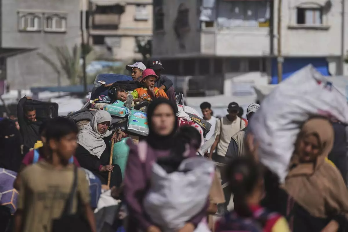 Displaced Palestinians flee from Khan Younis, Gaza, amid the ongoing Israeli military offensive in the area, on Monday, May 19, 2025. (AP Photo/Abdel Kareem Hana)
