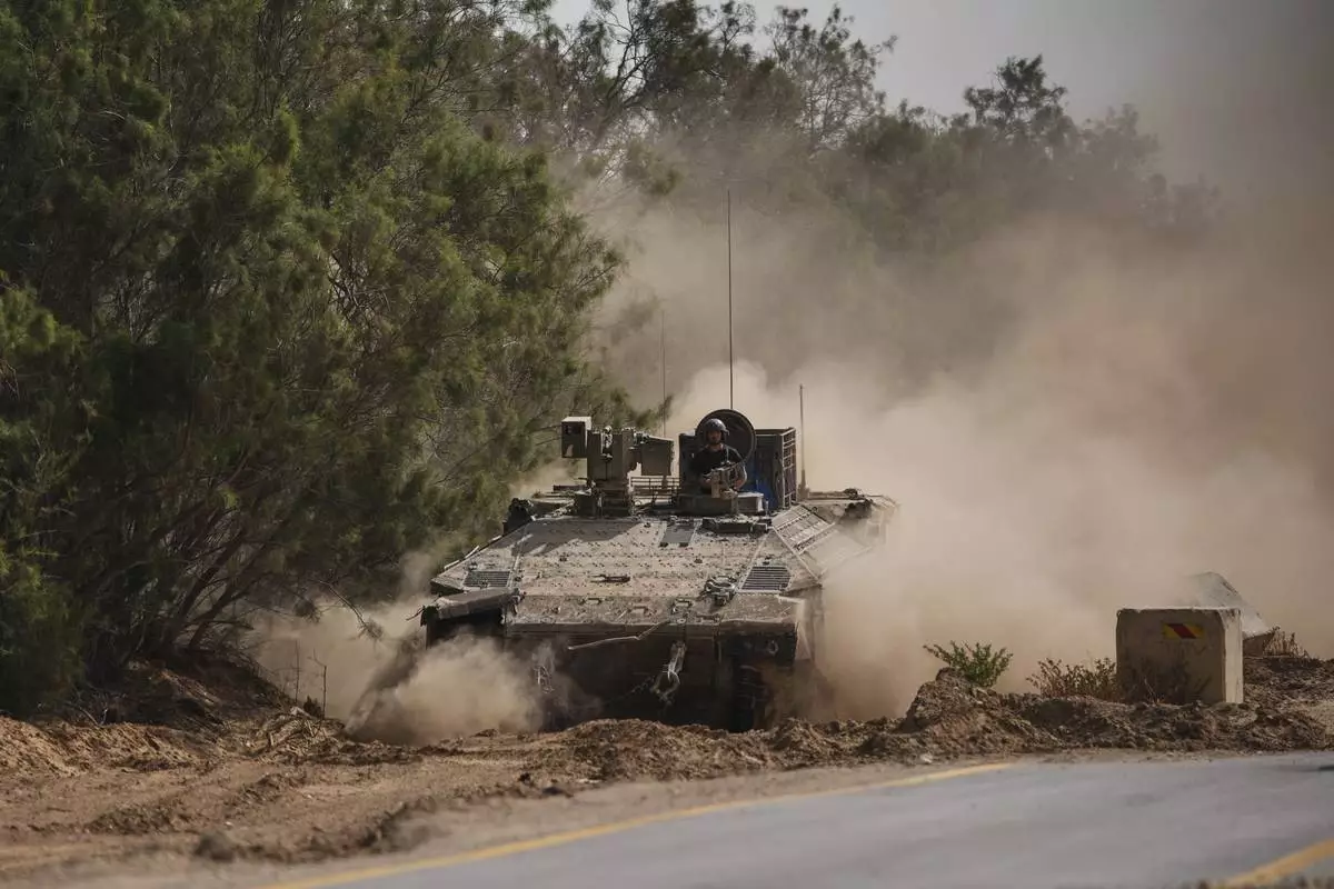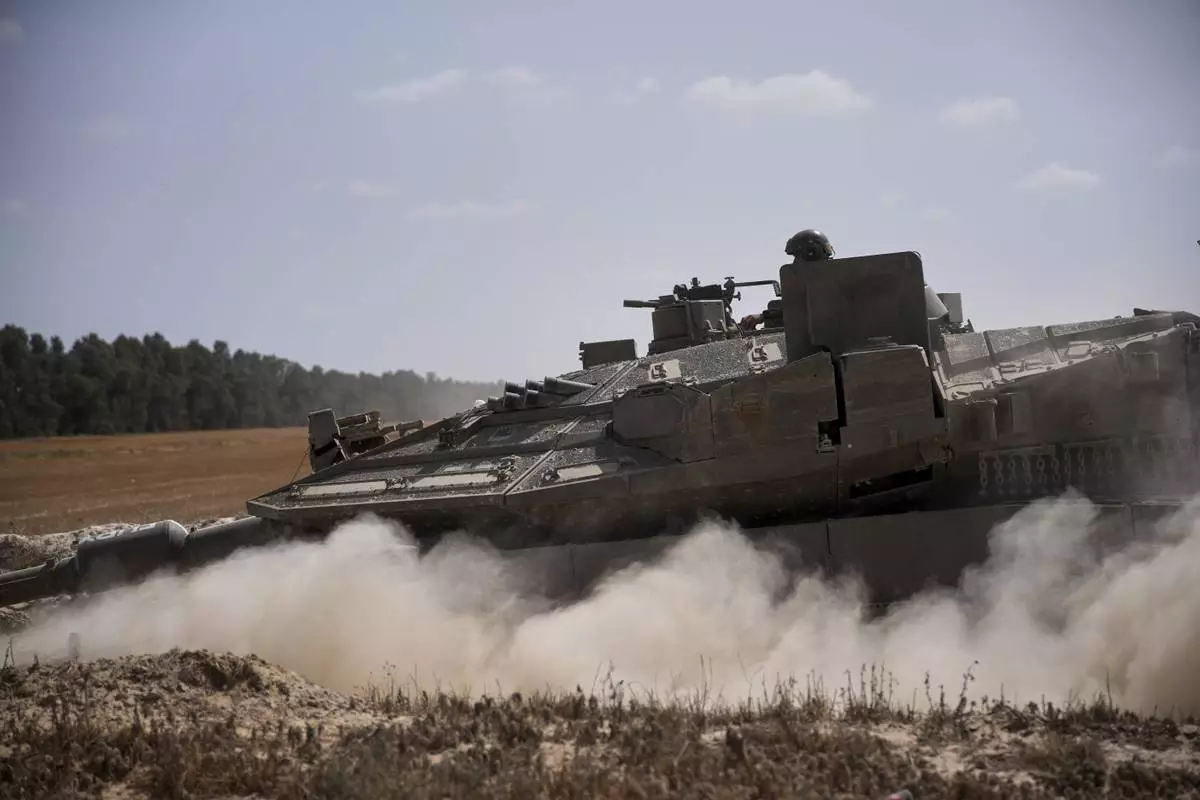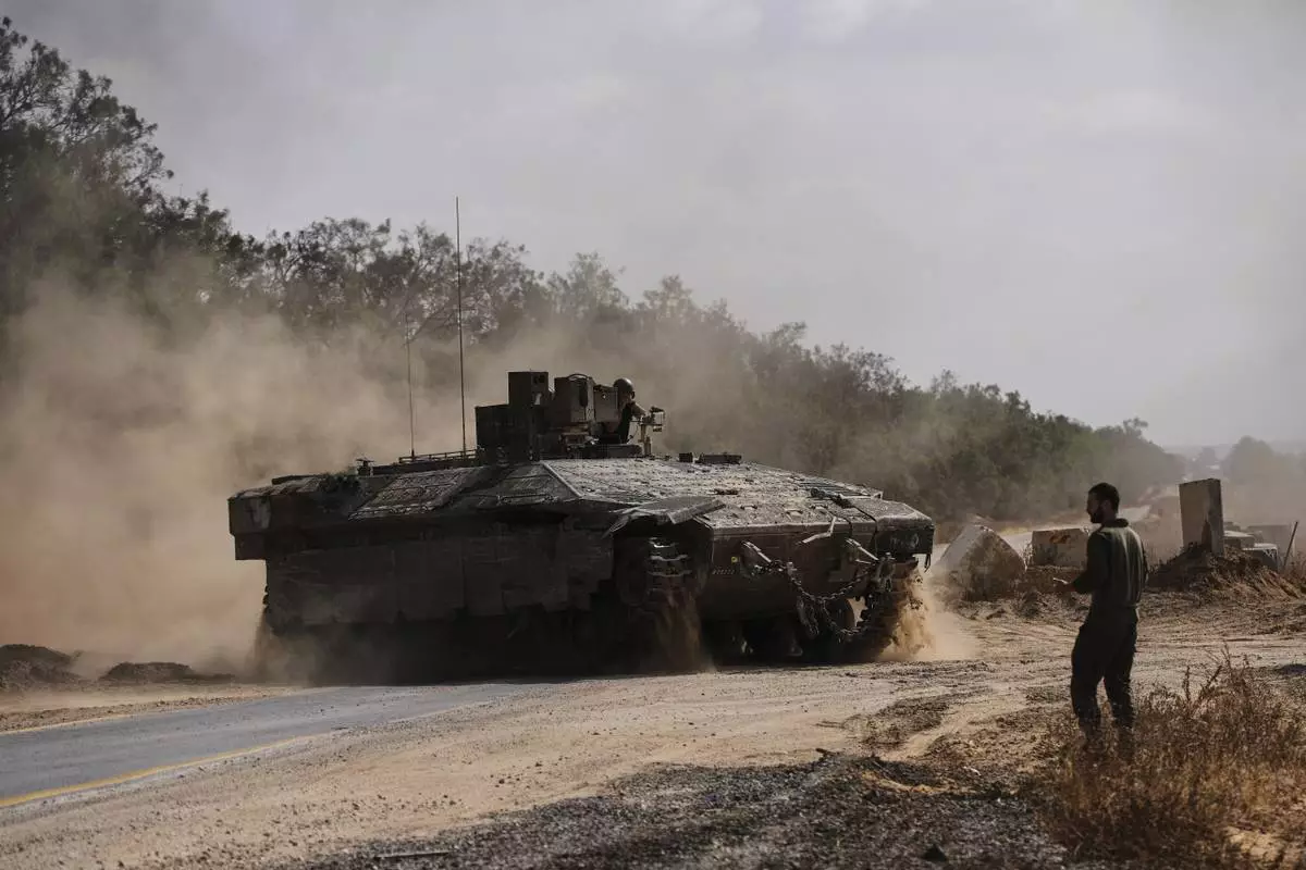 Israeli forces move along the border with the Gaza Strip, in southern Israel, Monday, May 19, 2025. (AP Photo/Ohad Zwigenberg)