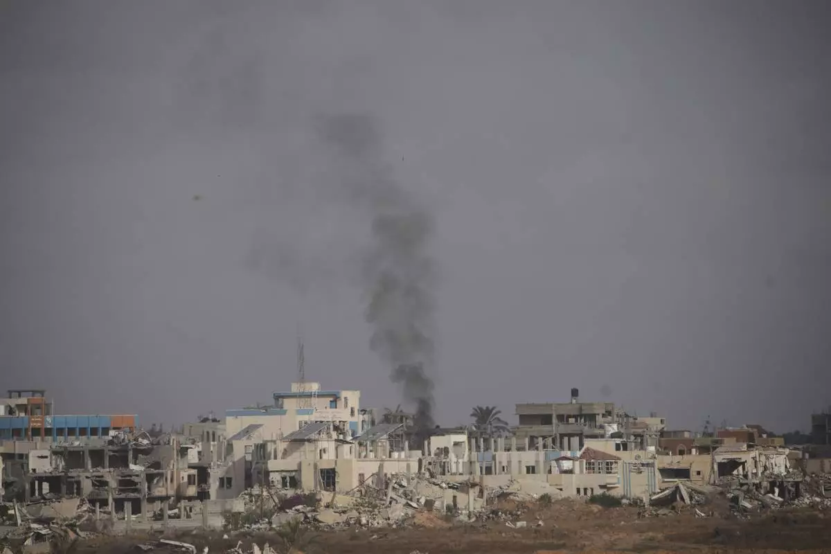 Smoke rises following an Israeli army bombardment in Khan Younis, Gaza, as seen from southern Israel, Monday, May 19, 2025. (AP Photo/Ohad Zwigenberg)
