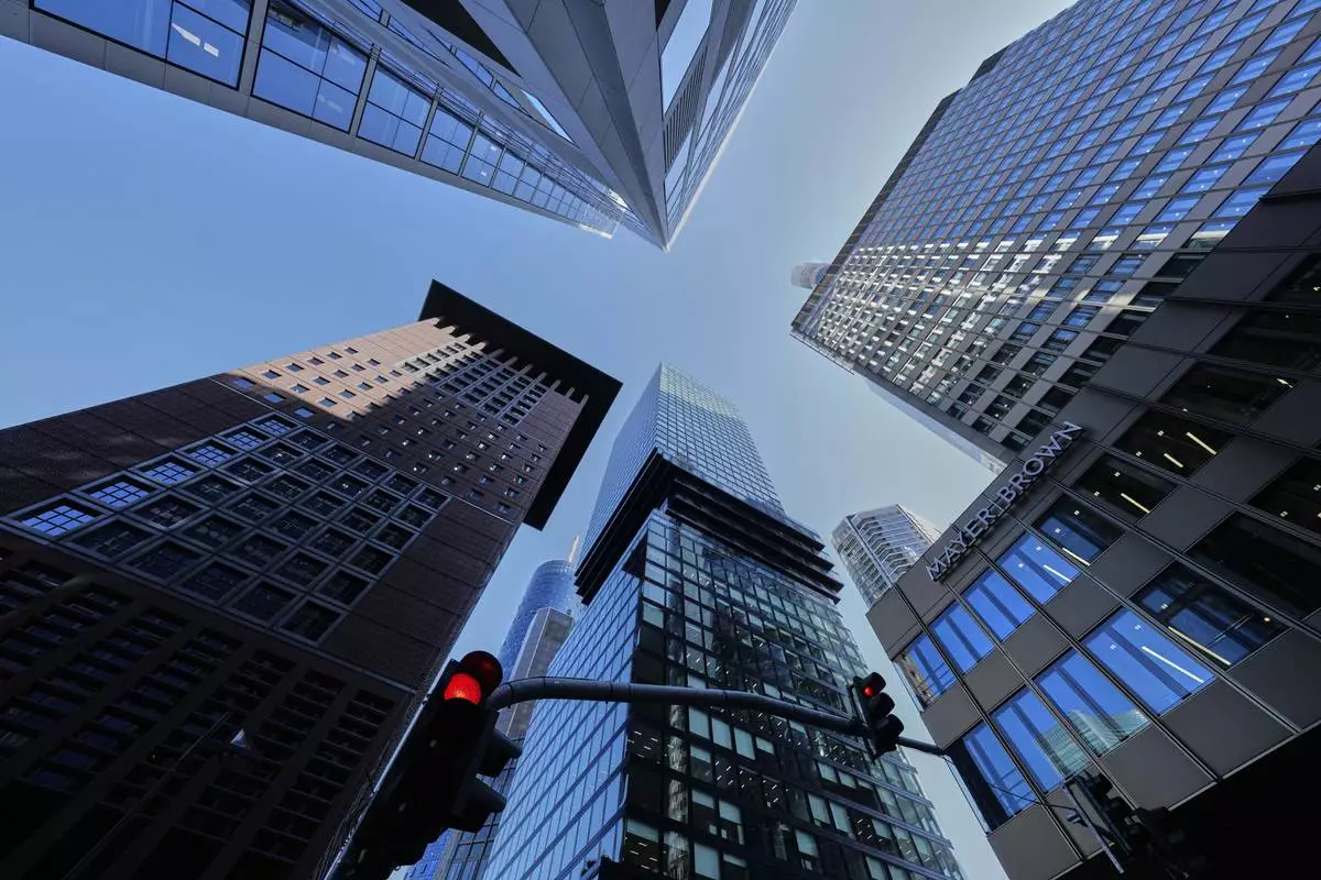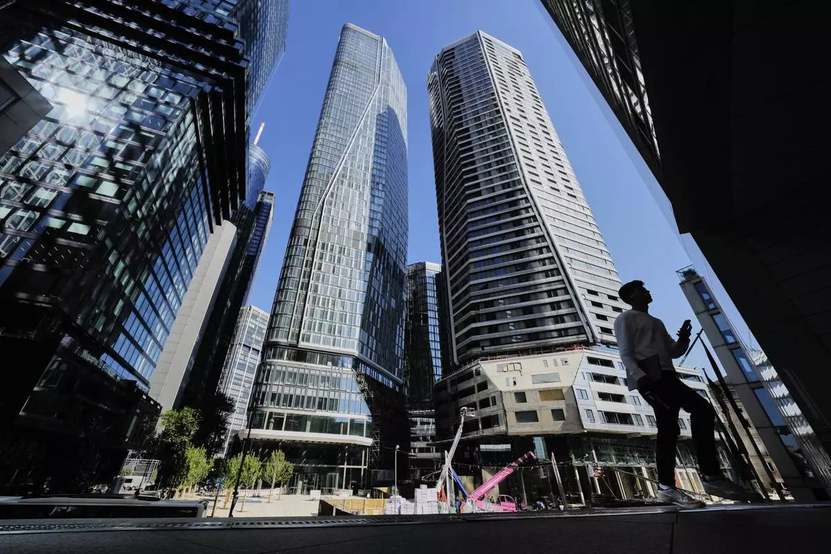 Buildings are pictured in the business district in Frankfurt, Germany, Monday, May 19, 2025. (AP Photo/Michael Probst)