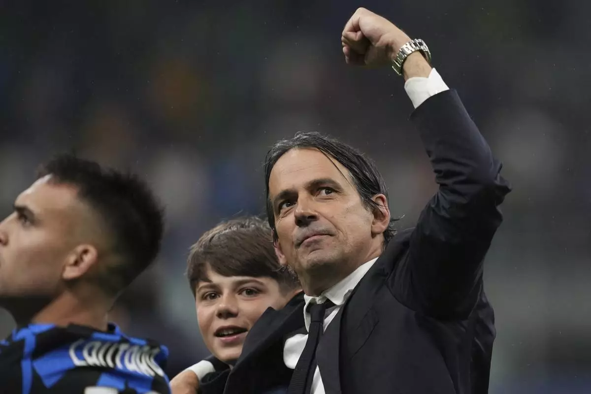 Inter Milan's head coach Simone Inzaghi celebrates after the Champions League semifinal second leg soccer match between Inter Milan and Barcelona at San Siro stadium in Milan , Italy, Tuesday, May 6, 2025. (AP Photo/Antonio Calanni)
