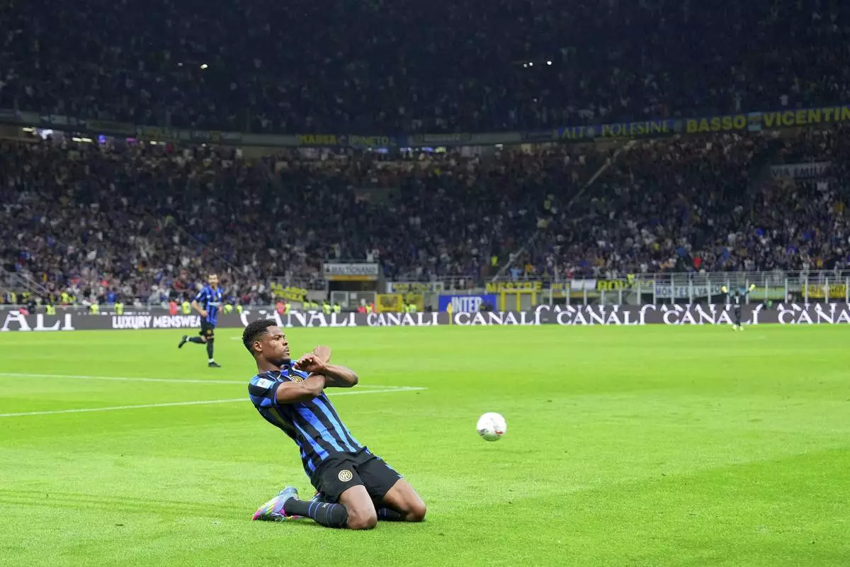 Inter Milan's Denzel Dumfries celebrates after scoring 2-1, during the Italian Serie A soccer match between Inter and Lazio at San Siro Stadium in Milan, Italy, Sunday, May 18, 2025. (Spada/LaPresse via AP)