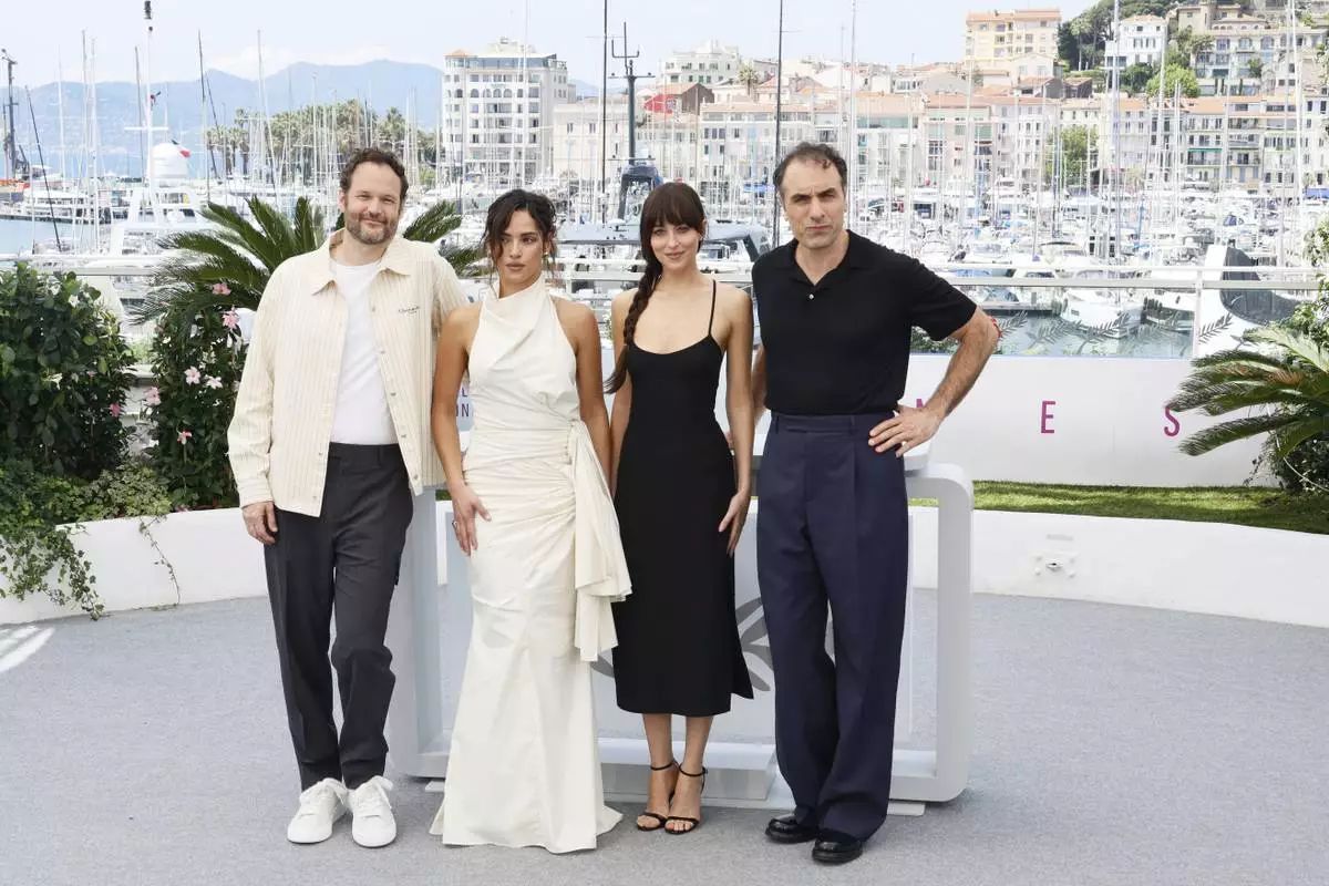 Producer Kyle Marvin, from left, Adria Arjona, Dakota Johnson and director Michael Angelo Covino pose for photographers at the photo call for the film 'Splitsville' at the 78th international film festival, Cannes, southern France, Monday, May 19, 2025. (Photo by Joel C Ryan/Invision/AP)