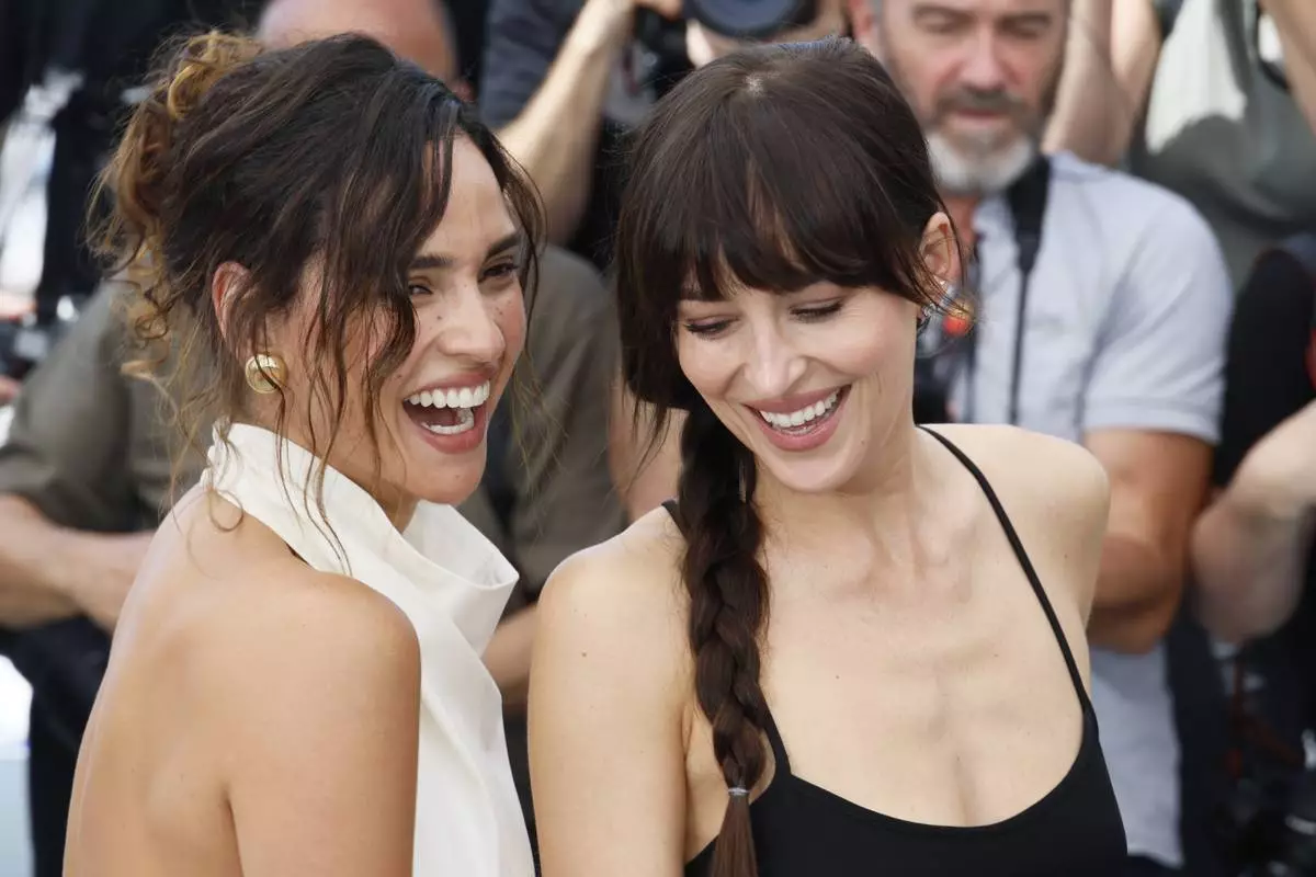 Adria Arjona, left, and Dakota Johnson pose for photographers at the photo call for the film 'Splitsville' at the 78th international film festival, Cannes, southern France, Monday, May 19, 2025. (Photo by Joel C Ryan/Invision/AP)