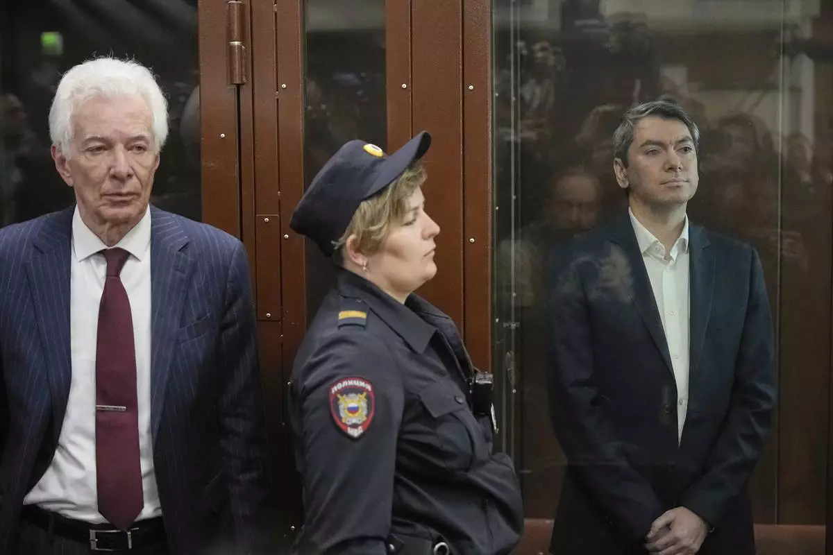 Grigory Melkonyants, right, co-chair of Russia's leading independent election monitoring group Golos who faces up to 5 years in prison, looks at the media standing in a cage in a courtroom prior to a hearing as Lawyer Mikhail Biryukov, stands near in Basmanny district court in Moscow, Russia, Wednesday, May 14, 2025. (AP Photo/Alexander Zemlianichenko)