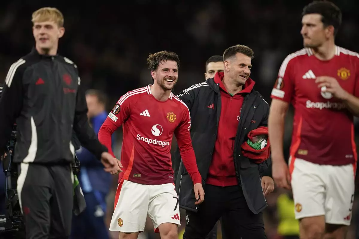 Manchester United's Mason Mount celebrates after the Europa League semifinal second leg soccer match between Manchester United and Athletic Bilbao in Manchester, Britain, Thursday, May 8, 2025. (AP Photo/Dave Thompson)