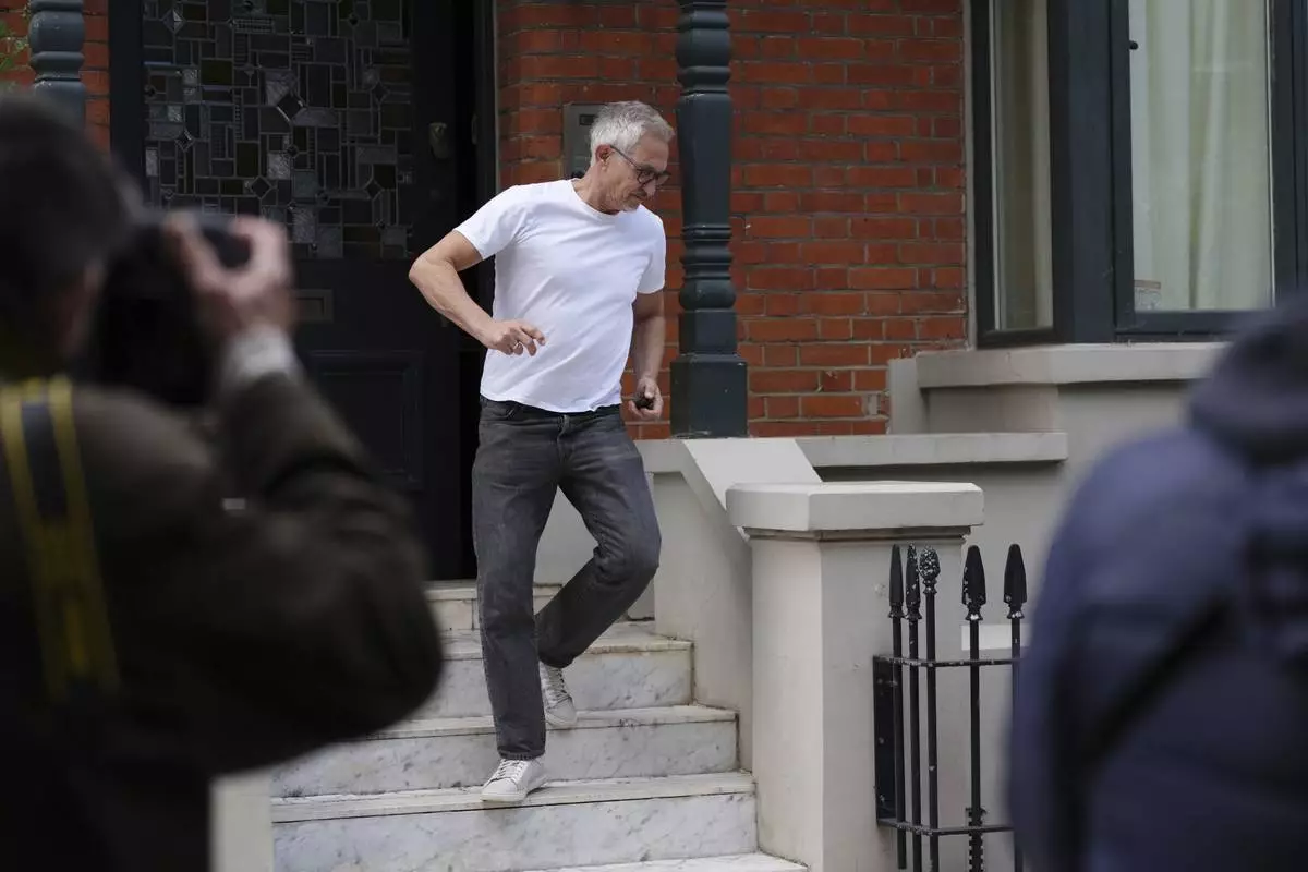 Gary Lineker, fomer England soccer player-turned-media celebrity, leaves his home in London, Monday May 19, 2025. (Ben Whitley/PA via AP)