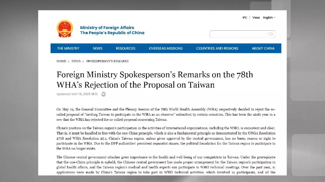 The spokesperson said that on Monday, the General Committee and the Plenary Session of the 78th WHA respectively decided to reject the proposal submitted by certain countries. This has been the ninth year in a row that the WHA has rejected the so-called proposal concerning Taiwan.