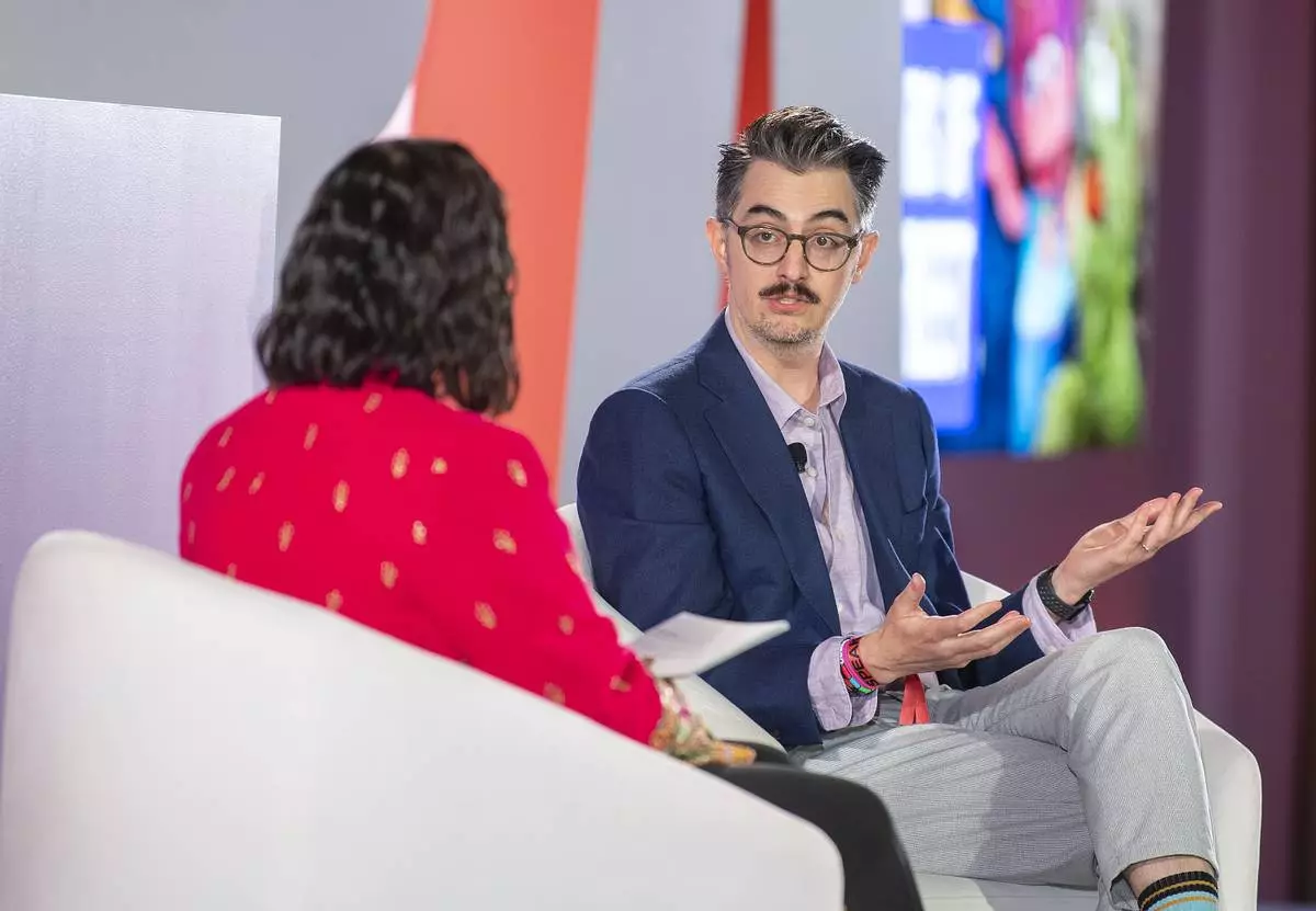 Sal Perez, executive producer and VP of Sesame Street at Sesame Workshop, right, talks to Versha Sharma, editor-in-chief at Teen Vogue, after Sesame Workshop won the Elevate Prize Foundation's Catalyst Award, Wednesday, May 14, 2025, in Miami Beach, Fla. (AP Photo/Michael Laughlin)