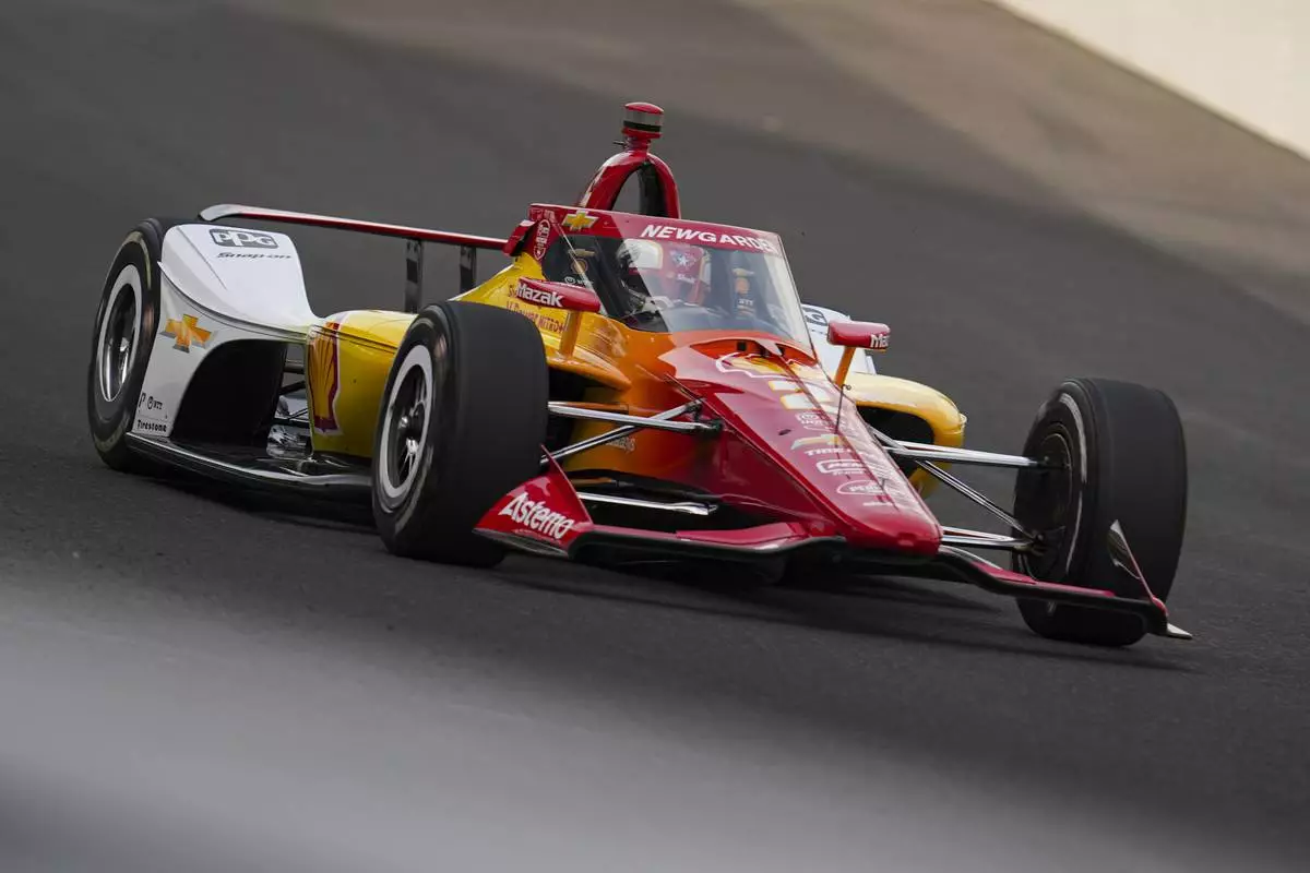 Josef Newgarden drives through the first turn during practice for the Indianapolis 500 auto race at Indianapolis Motor Speedway in Indianapolis, Thursday, May 15, 2025. (AP Photo/Michael Conroy)