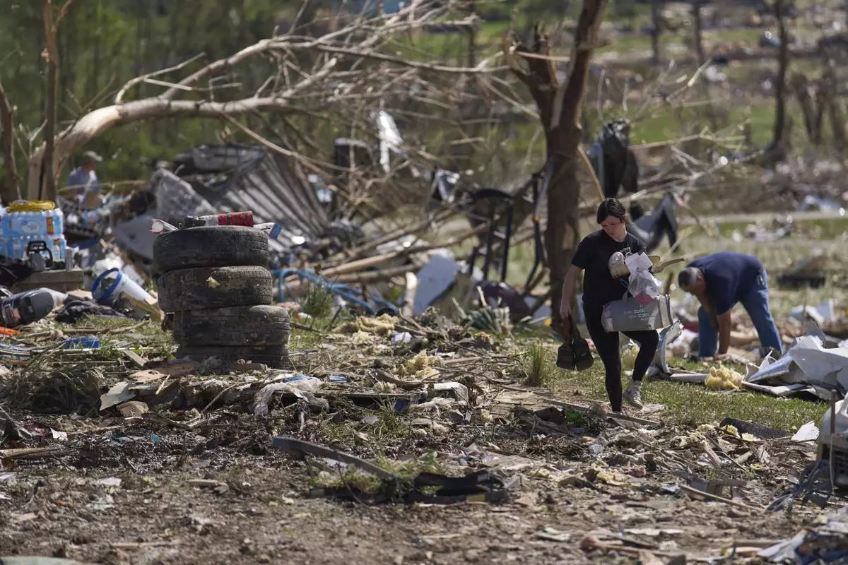 Macey Coffey carries salvageable items from what isleft of Edwina Wilson's destroyed home, Sunday, May 18, 2025, in London, Ky., after a severe storm passed through the area. (AP Photo/Carolyn Kaster)