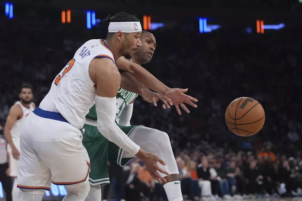 New York Knicks' Josh Hart (3) and Boston Celtics' Al Horford (42) fights for control of the ball during the first half of Game 6 in the Eastern Conference semifinals of the NBA basketball playoffs Friday, May 16, 2025, in New York. (AP Photo/Frank Franklin II)