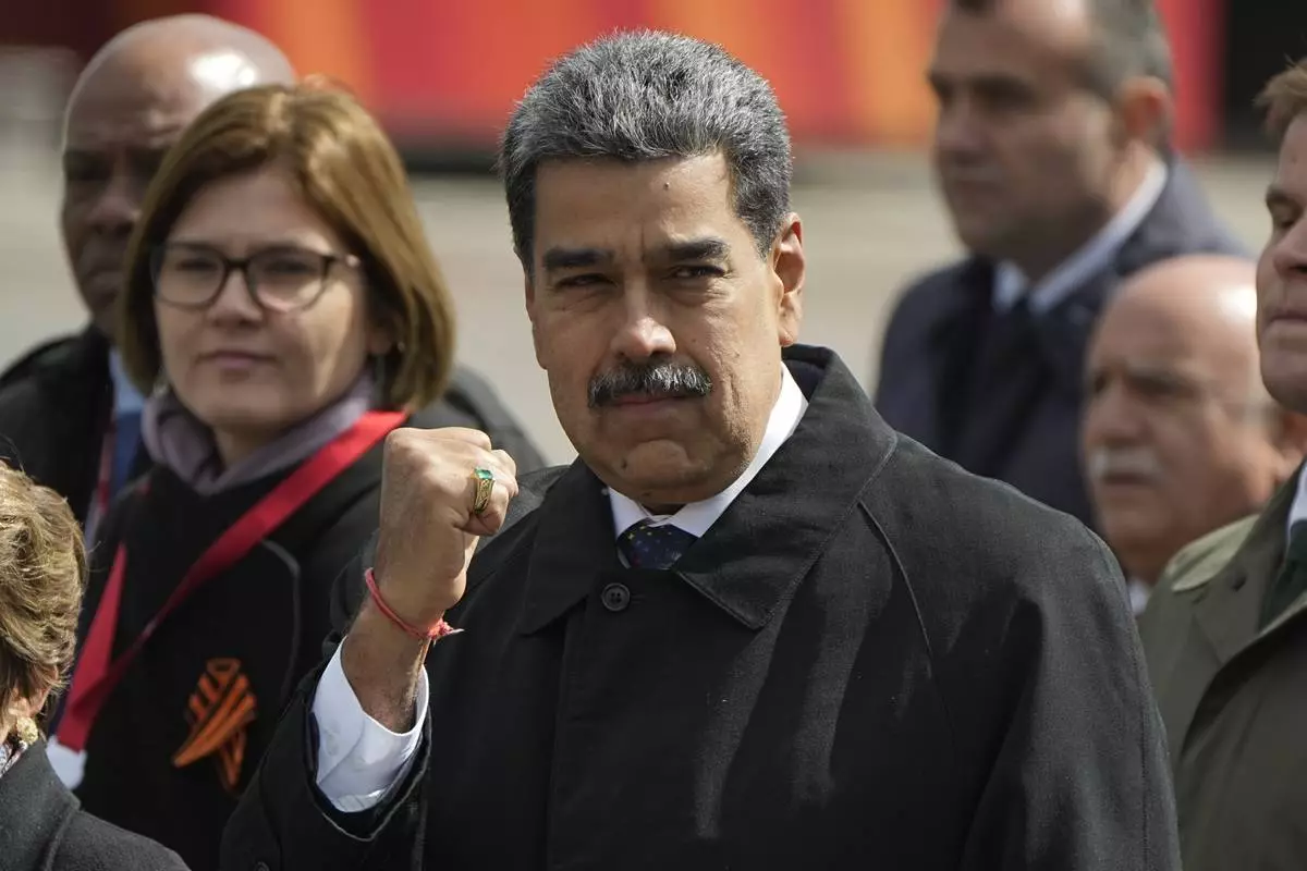 Venezuela's President Nicolas Maduro gestures as he walks in Red square after the Victory Day military parade in Moscow, Russia, Friday, May 9, 2025, during celebrations of the 80th anniversary of the Soviet Union's victory over Nazi Germany during the World War II. (AP Photo/Pavel Bednyakov, Pool)