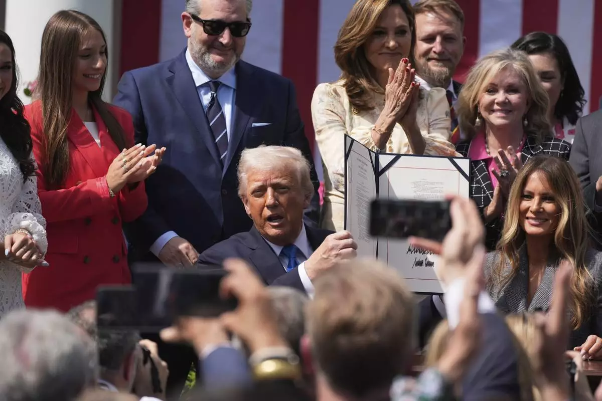 President Donald Trump, with first lady Melania Trump and others, after signing the "Take It Down Act" during a ceremony in the Rose Garden at the White House, Monday, May 19, 2025. (AP Photo/Manuel Balce Ceneta)