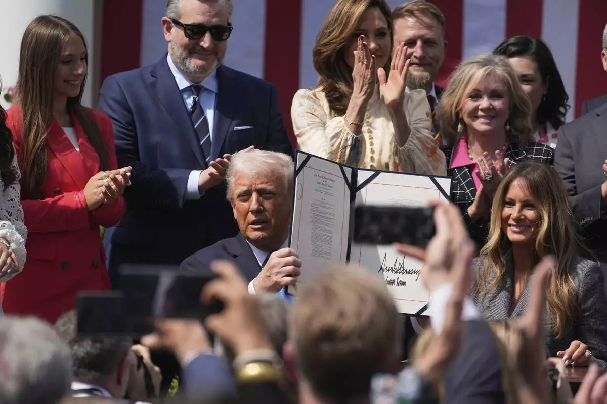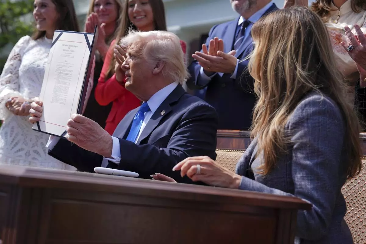 WASHINGTON (AP) — President Donald Trump on Monday signed into law the Take It Down Act, a measure that imposes penalties for online sexual exploitation that first lady Melania Trump helped usher through Congress, and he had her sign it, too, despite what sounded like a mild objection on her part.