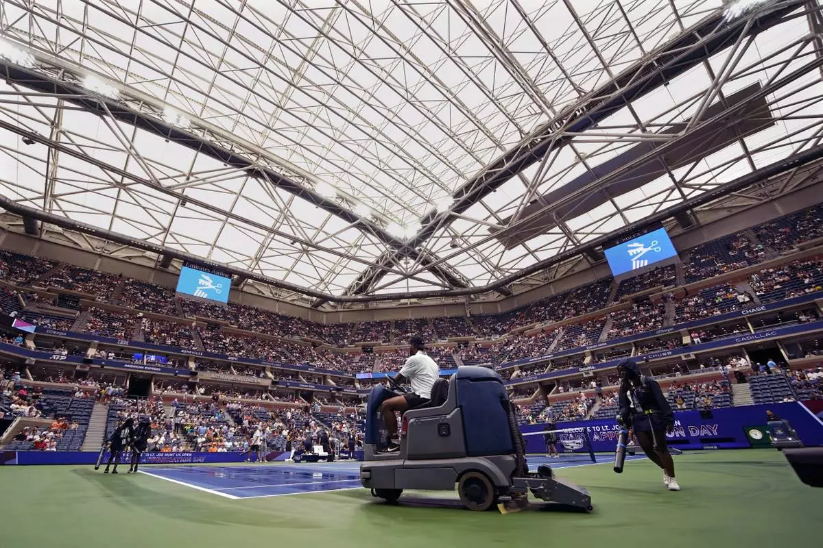 FILE - Court workers dry the playing surface at Arthur Ashe Stadium after a sudden downpour with the retractable roof open caused play to be delayed between Petra Kvitova, of the Czech Republic, and Jessica Pegula, of the United States, during the fourth round of the U.S. Open tennis championships, Monday, Sept. 5, 2022, in New York. (AP Photo/Julia Nikhinson, file)