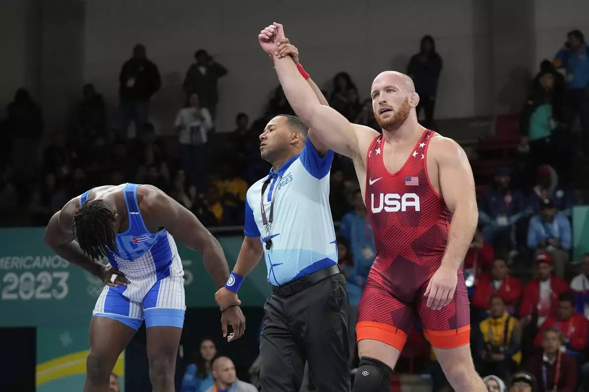FILE - United States' Kyle Snyder, right, celebrates after winning gold against Cuba's Arturo Silot, left, during the men's 97kg wrestling freestyle final bout at the Pan American Games Santiago, Chile, Nov. 1, 2023. (AP Photo/Matias Delacroix, File)