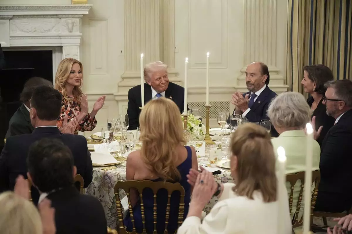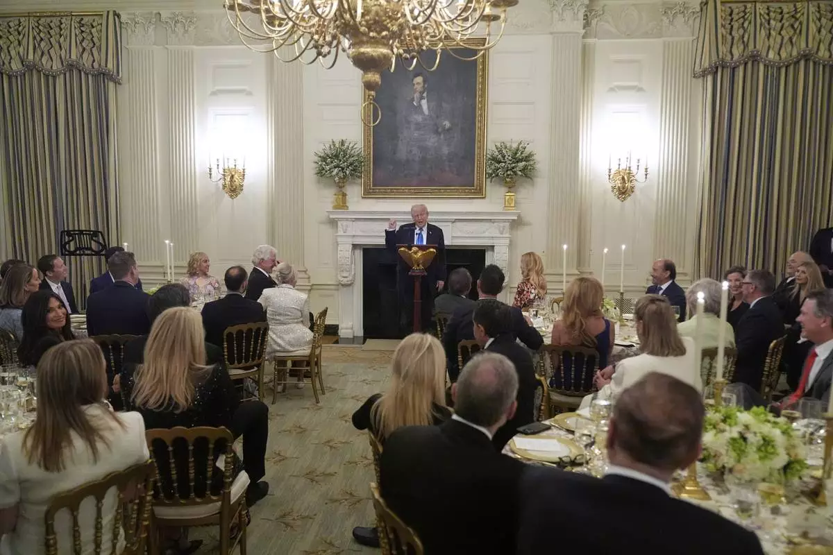 President Donald Trump attends a Kennedy Center board dinner in the State Dining Room at the White House, Monday, May 19, 2025, in Washington. (AP Photo/Manuel Balce Ceneta)
