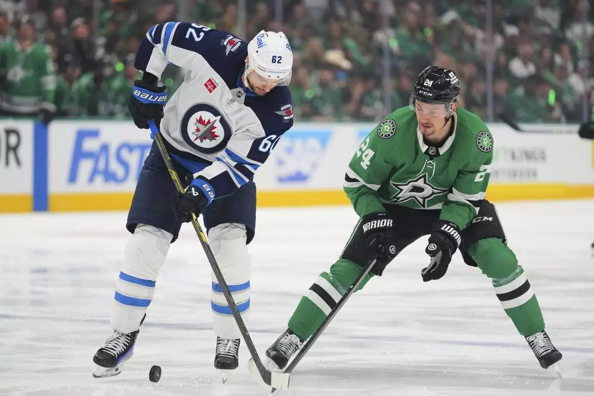 Winnipeg Jets' Nino Niederreiter (62) and Dallas Stars' Jason Robertson, right, compete for control of the puck in the third period of Game 3 of a second-round NHL hockey playoff series in Dallas, Sunday, May 11, 2025. (AP Photo/Julio Cortez)