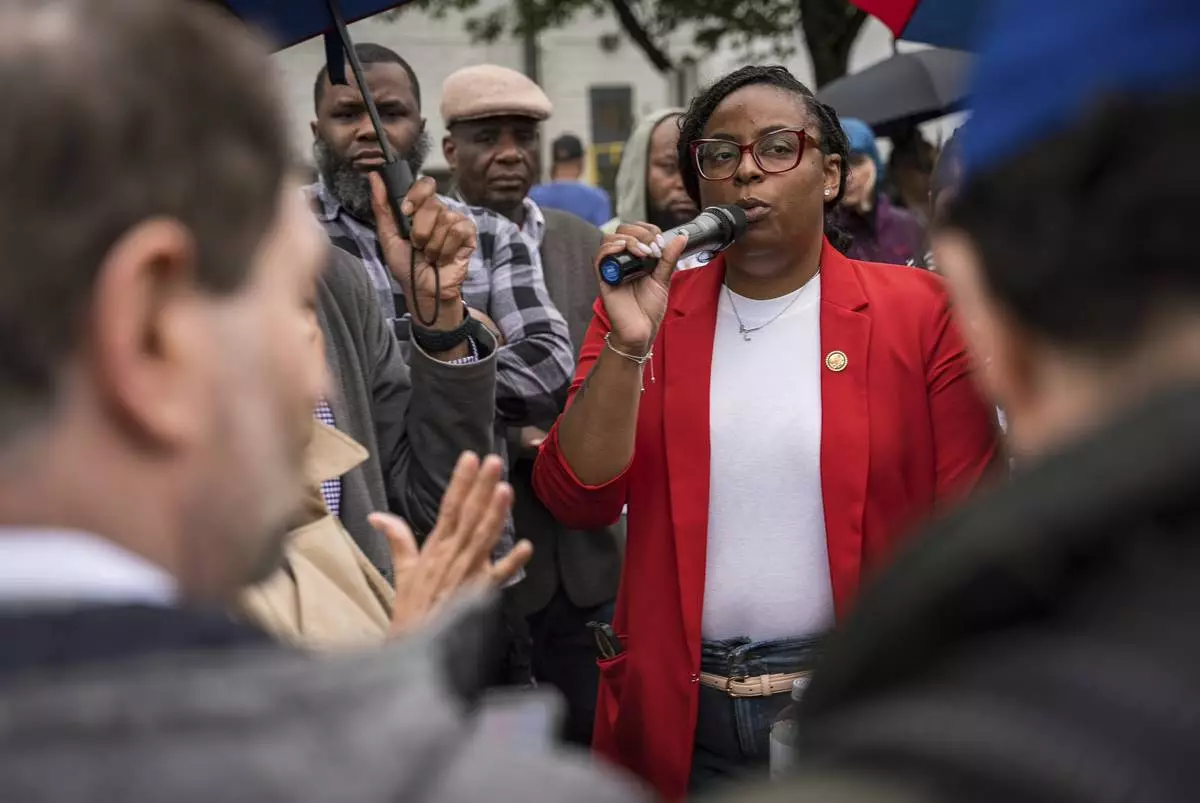 Congresswoman Rep. LaMonica McIver demands the release of Newark Mayor Ras Baraka after his arrest while protesting outside an ICE detention prison, Friday, May 9, 2025, in Newark, N.J, (AP Photo/Angelina Katsanis)