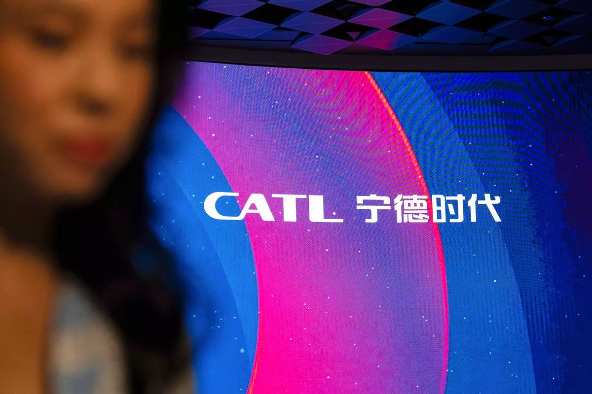 Signage of Contemporary Amperex Technology Co. (CATL) is displayed on the digital screen at the listing ceremony in Hong Kong, Tuesday, May. 20, 2025. (AP Photo/Chan Long Hei)