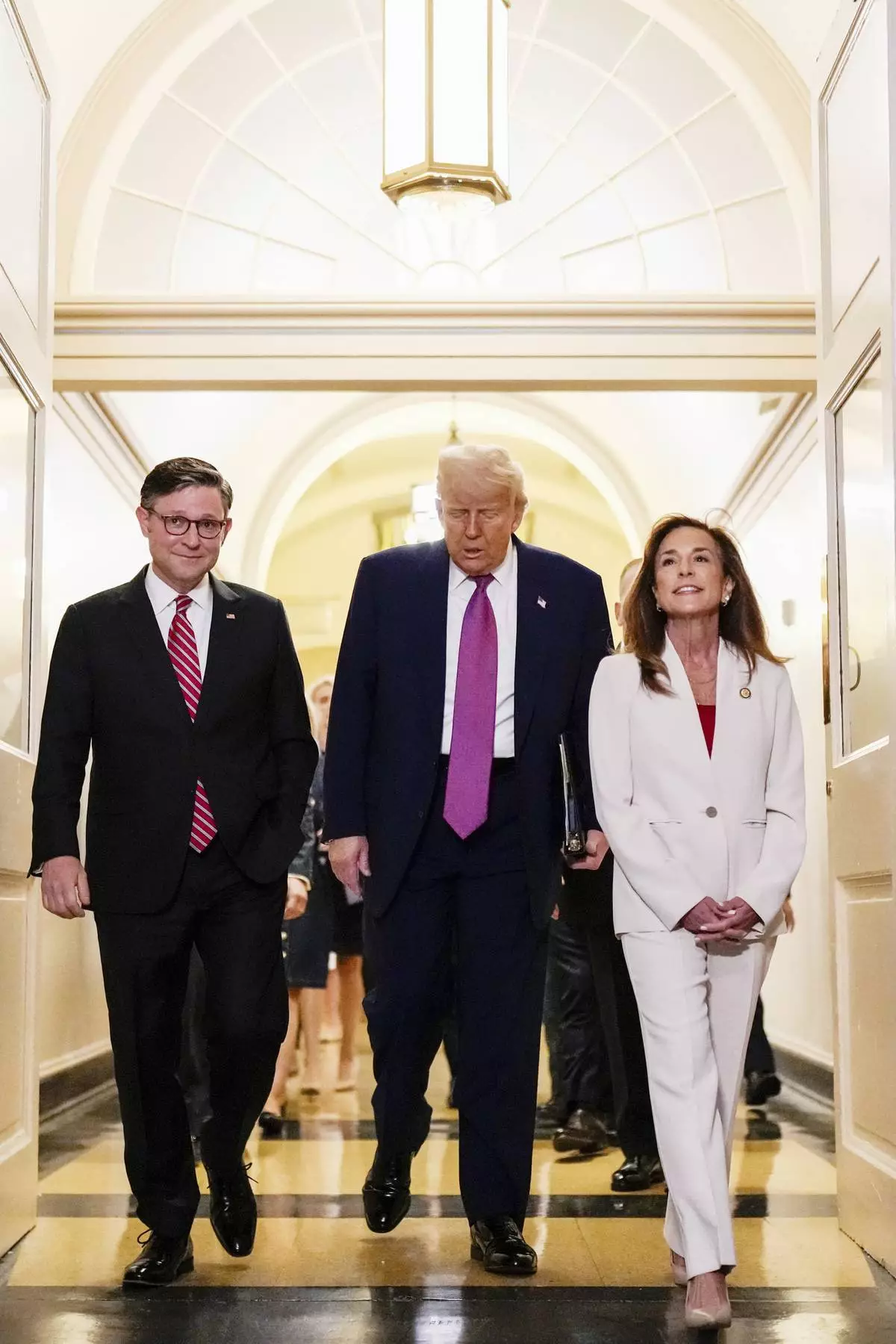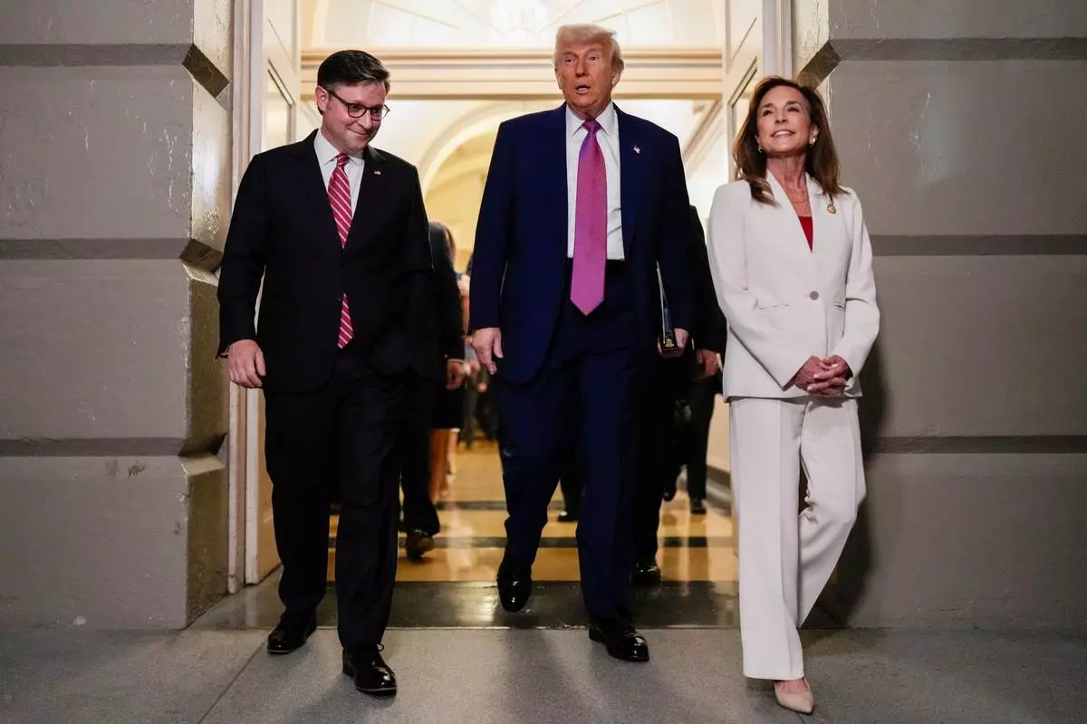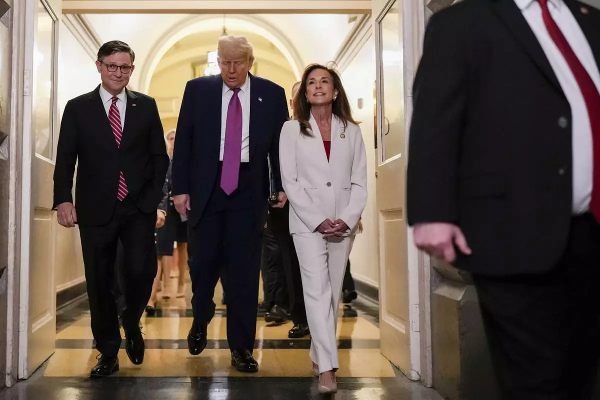 Speaker of the House Mike Johnson, R-La., President Donald Trump and Rep. Lisa McClain, R-Mich., arrive for a House Republican conference meeting, Tuesday, May 20, 2025, at the U.S. Capitol in Washington. (AP Photo/Julia Demaree Nikhinson)