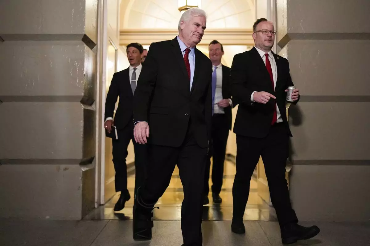 House Majority Whip Tom Emmer, R-Minn., center, arrives for a House Republican conference meeting, Tuesday, May 20, 2025, at the U.S. Capitol in Washington. (AP Photo/Julia Demaree Nikhinson)