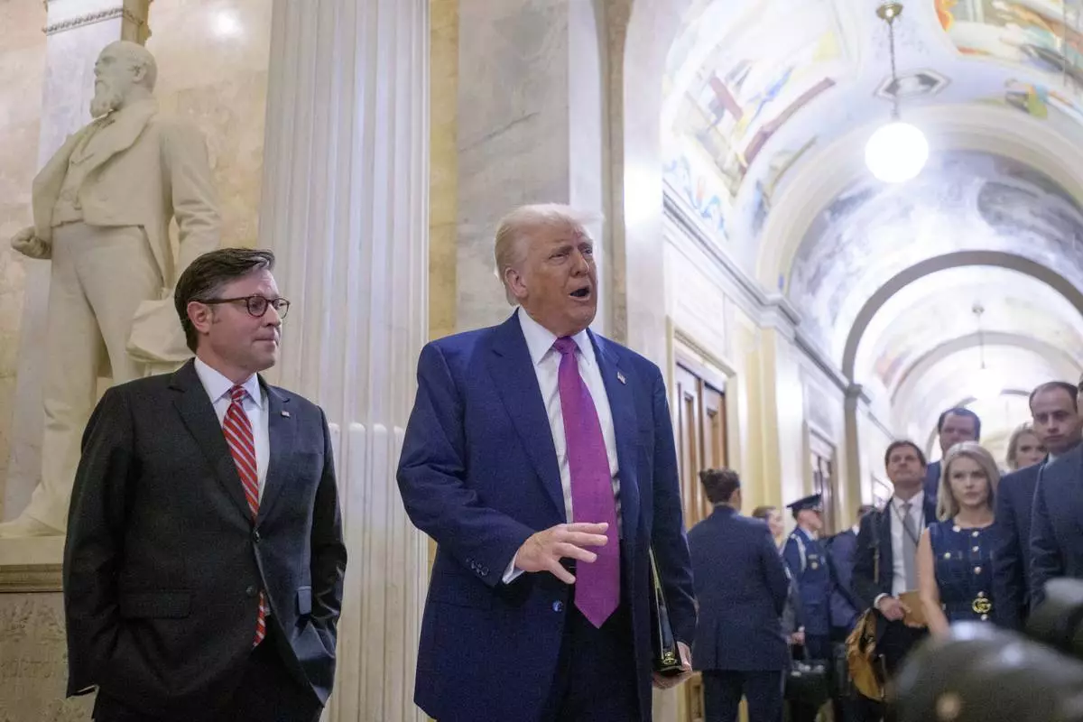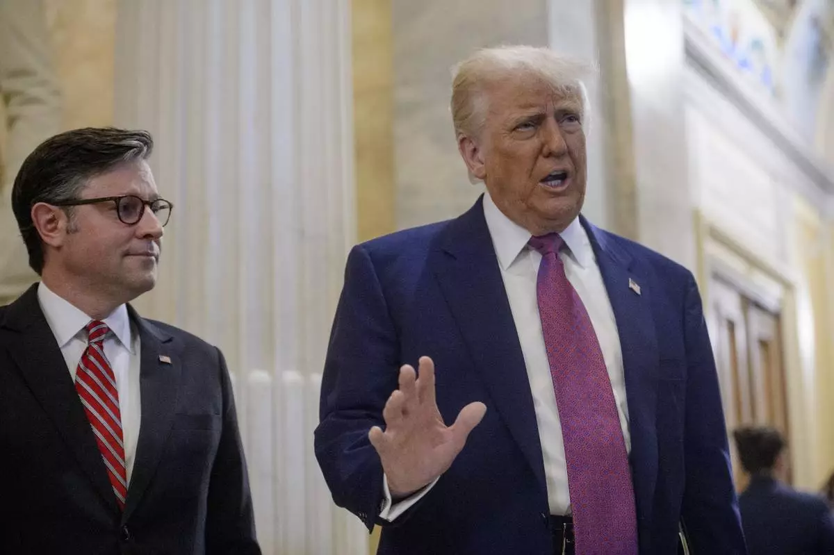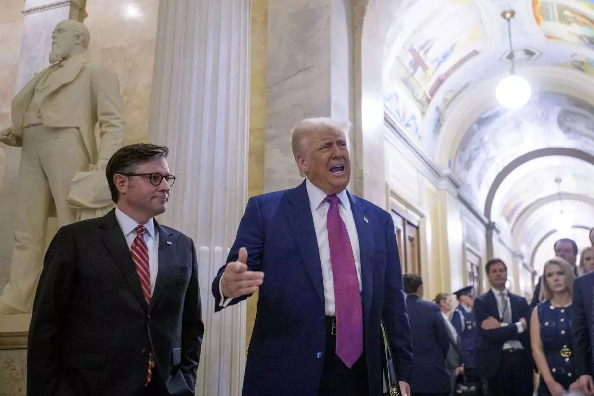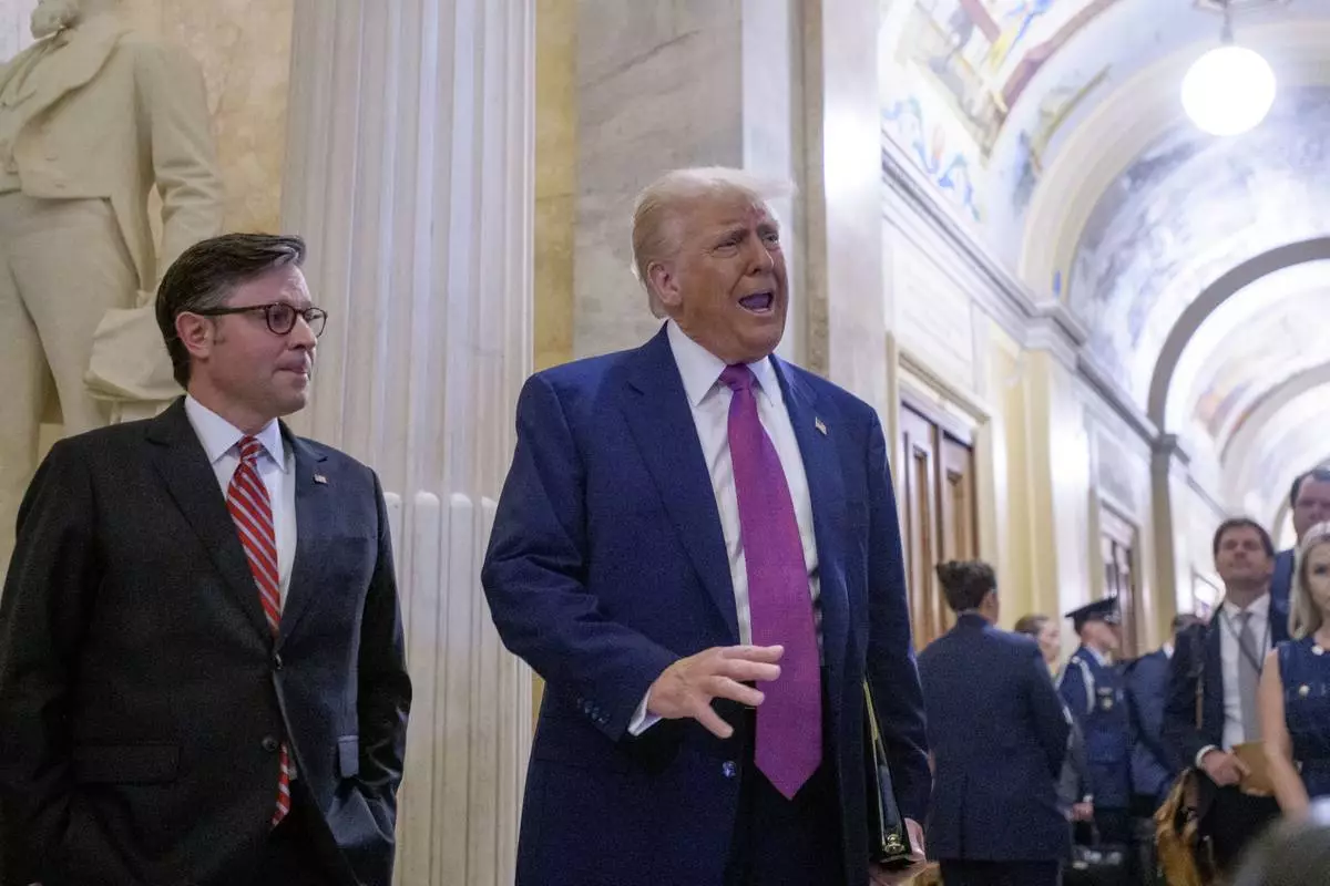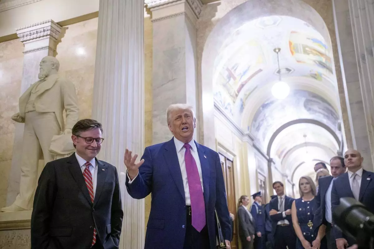 President Donald Trump, right, is joined by Speaker of the House Mike Johnson, R-La., as he arrives for a meeting with the House Republican Conference at the Capitol, Tuesday, May 20, 2025, in Washington. (AP Photo/Rod Lamkey, Jr.)