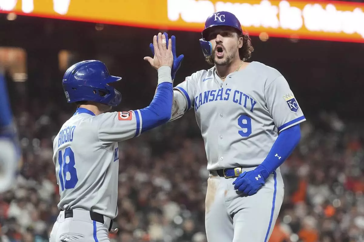 After Schmitt’s double, the Giants had runners at second and third with one out in the seventh. Tyler Fitzgerald then hit a soft liner to shortstop Bobby Witt Jr., who flipped the ball to third baseman Maikel Garcia to double off Willy Adames and end the inning.