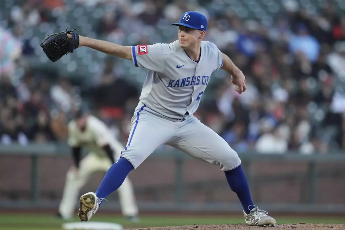 Kansas City Royals pitcher Kris Bubic throws against the San Francisco Giants during the first inning of a baseball game in San Francisco, Monday, May 19, 2025. (AP Photo/Jeff Chiu)