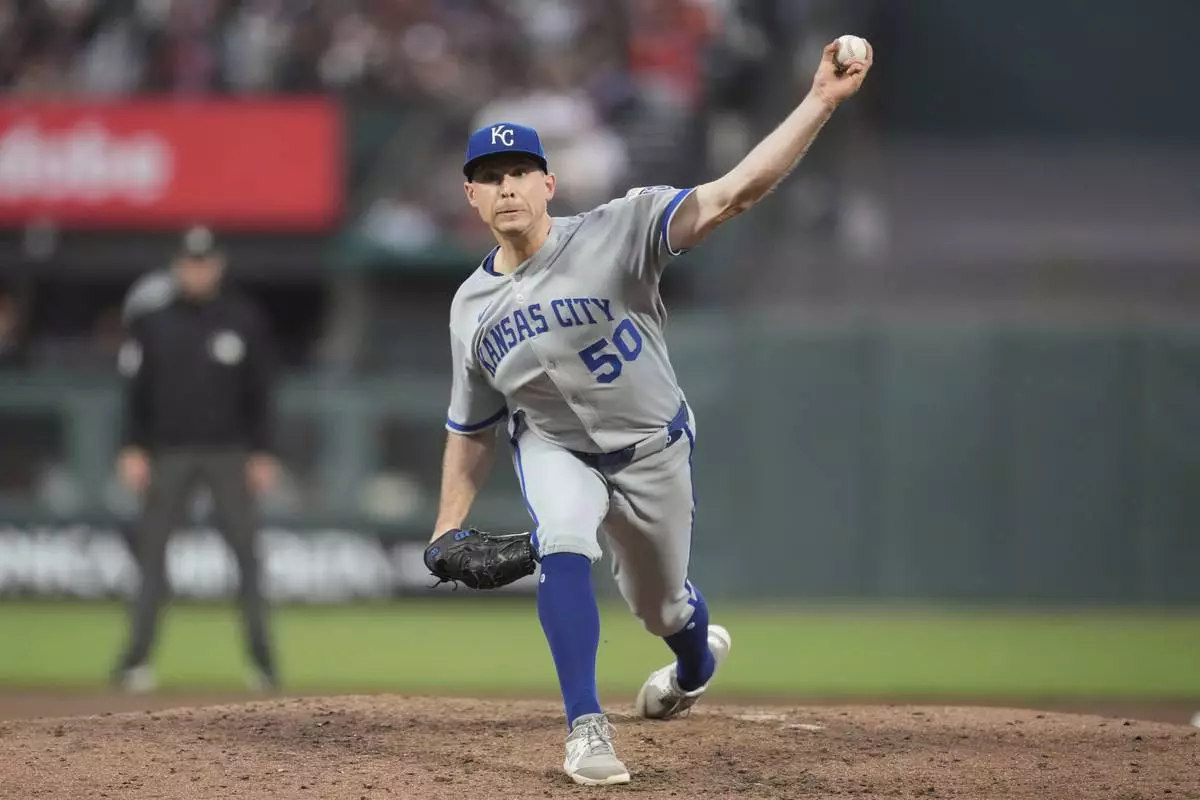 Kansas City Royals pitcher Kris Bubic (50) reacts after San Francisco Giants' Tyler Fitzgerald lined into a double play during the seventh inning of a baseball game in San Francisco, Monday, May 19, 2025. (AP Photo/Jeff Chiu)