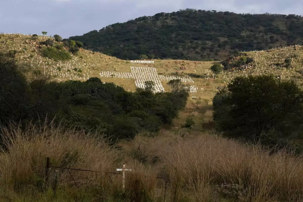 A view of crosses planted at the White Cross Monument, each one marking a white farmer who has been killed in a farm murder, is seen on a hillside in Ysterberg near Polokwane, South Africa, May 15, 2025. (AP Photo/Themba Hadebe)