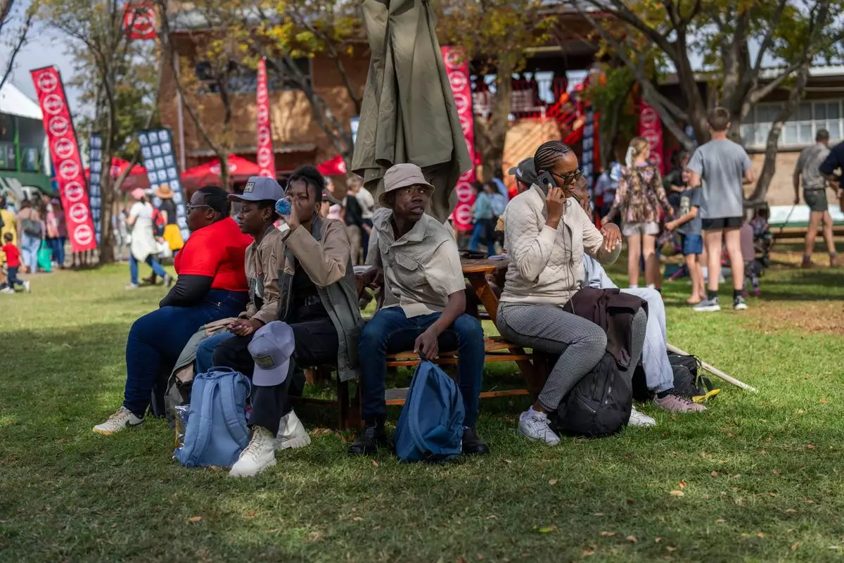 Visitors at the Nampo agricultural fair, one of the largest in the southern hemisphere, sit in there shade near Bothaville, South Africa, May 15, 2025. (AP Photo/Jerome Delay)