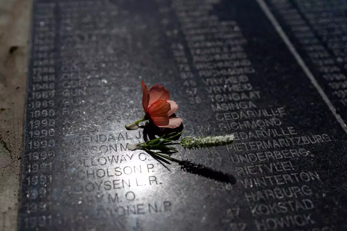 A rose is set on Visitors at the Nampo agricultural fair, one of the largest in the southern hemisphere, walk past the wall of remembrance, a tribute to farmers killed since 1961, at the Nampo agricultural fair, one of the largest in the southern hemisphere, near Bothaville, South Africa, May 15, 2025. (AP Photo/Jerome Delay)