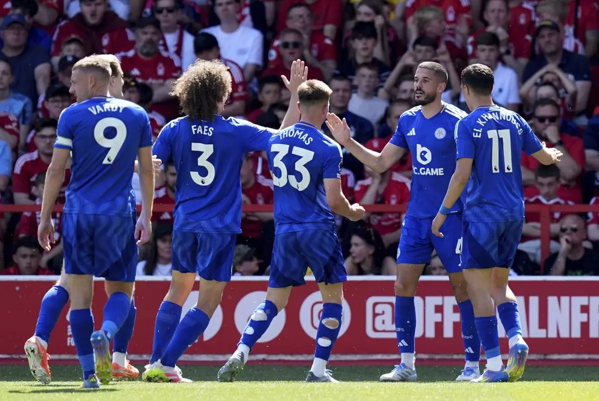 Leicester City's Conor Coady, second right, celebrates with his teammates after scoring during the Premier League soccer match against Nottingham Forest at City Ground, Nottingham, Sunday May 11, 2025. (Jacob King/PA via AP)