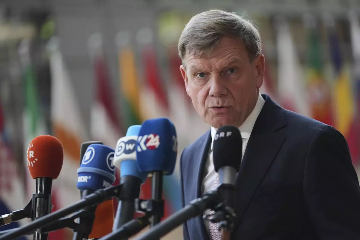 Germany's Foreign Minister Johann Wadephul speaks with the media as he arrives for a meeting of EU foreign ministers at the European Council building in Brussels, Belgium, Tuesday, May 20, 2025. (AP Photo/Virginia Mayo)