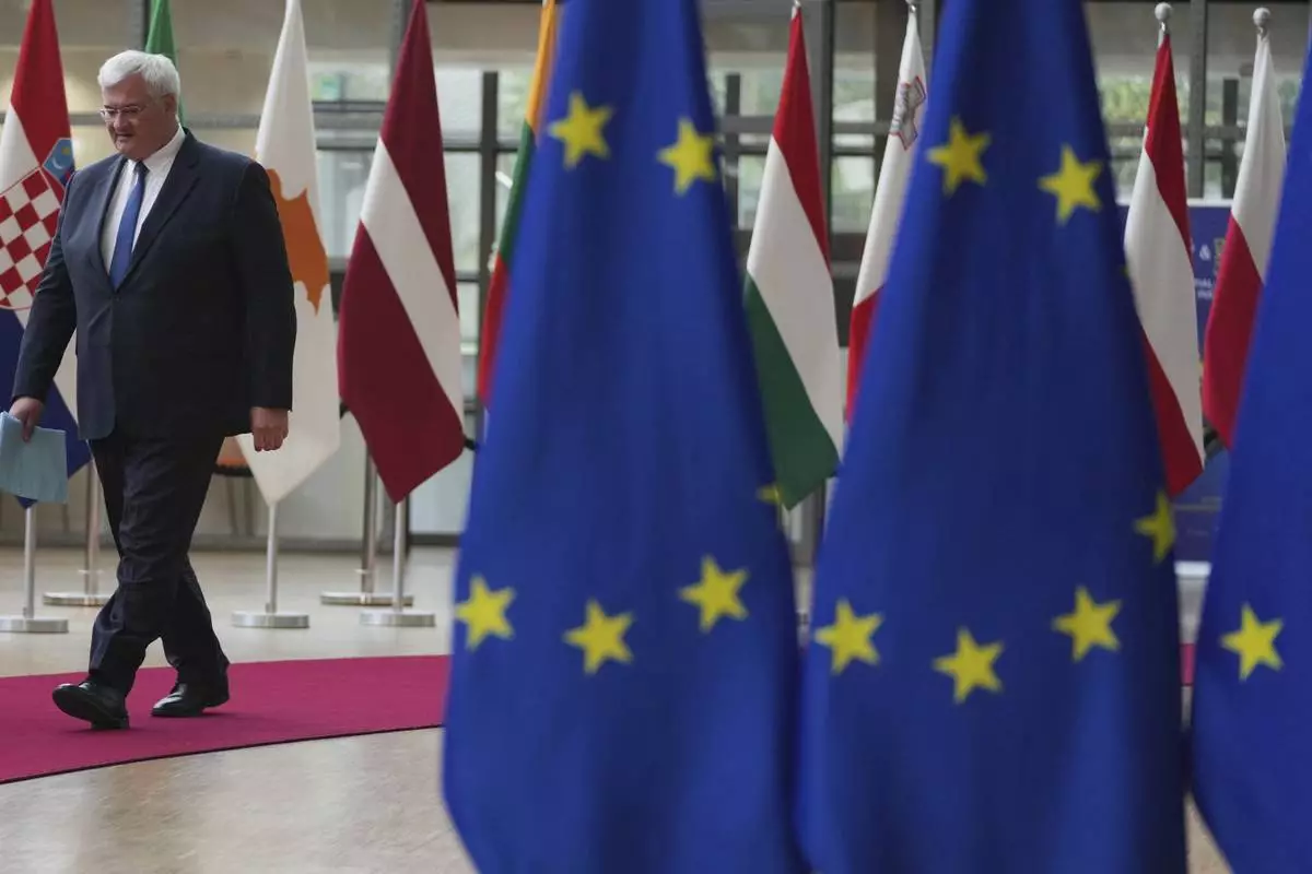 Ukraine's Foreign Minister Andrii Sybiha arrives for a meeting of EU foreign ministers at the European Council building in Brussels, Belgium, Tuesday, May 20, 2025. (AP Photo/Virginia Mayo, Pool)