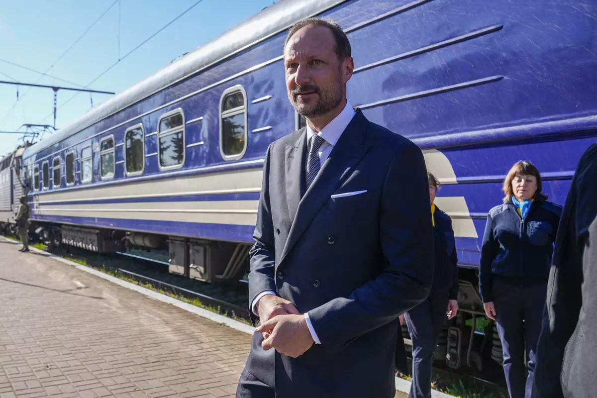 Norway's Crown Prince Haakon arrives at the train station in Kyiv, Ukraine, Tuesday, May 20, 2025. (Heiko Junge/NTB Scanpix via AP)