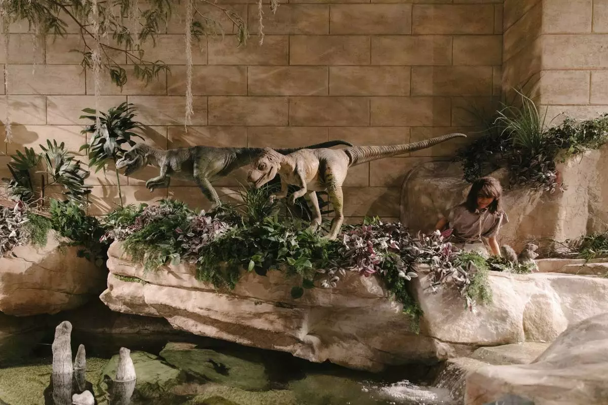 Replicas of dinosaurs and an early human -- which according to evolutionary scientists are separated by tens of millions of years -- are displayed side-by-side in the main hall of the Creation Museum in Petersburg, Ky., Friday, March 21, 2025. (AP Photo/Madeleine Hordinski)