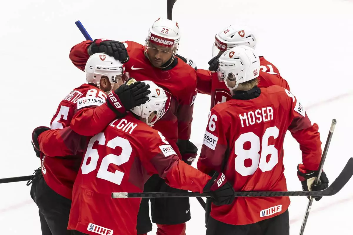 Switzerland's Sven Andrighetto, left, celebrates his side's second goal during the IIHF 2025 Ice Hockey World Championship group B match between Switzerland and Kazakhstan in Herning, Denmark, Tuesday, May 20, 2025. (Salvatore Di Nolfi/Keystone via AP)