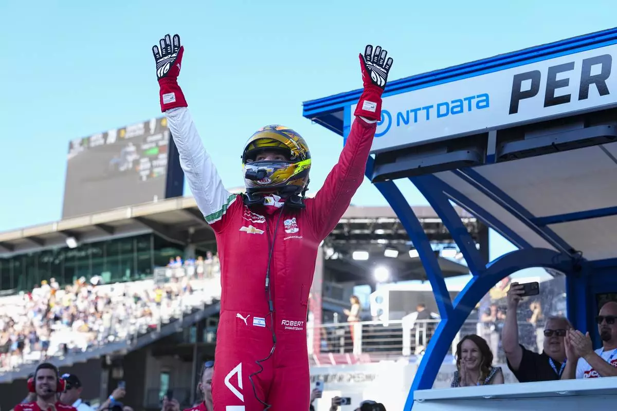 Robert Shwartzman, of Israel, celebrates after winning the pole position during qualifications for the Indianapolis 500 auto race at Indianapolis Motor Speedway in Indianapolis, Sunday, May 18, 2025. (AP Photo/Michael Conroy)