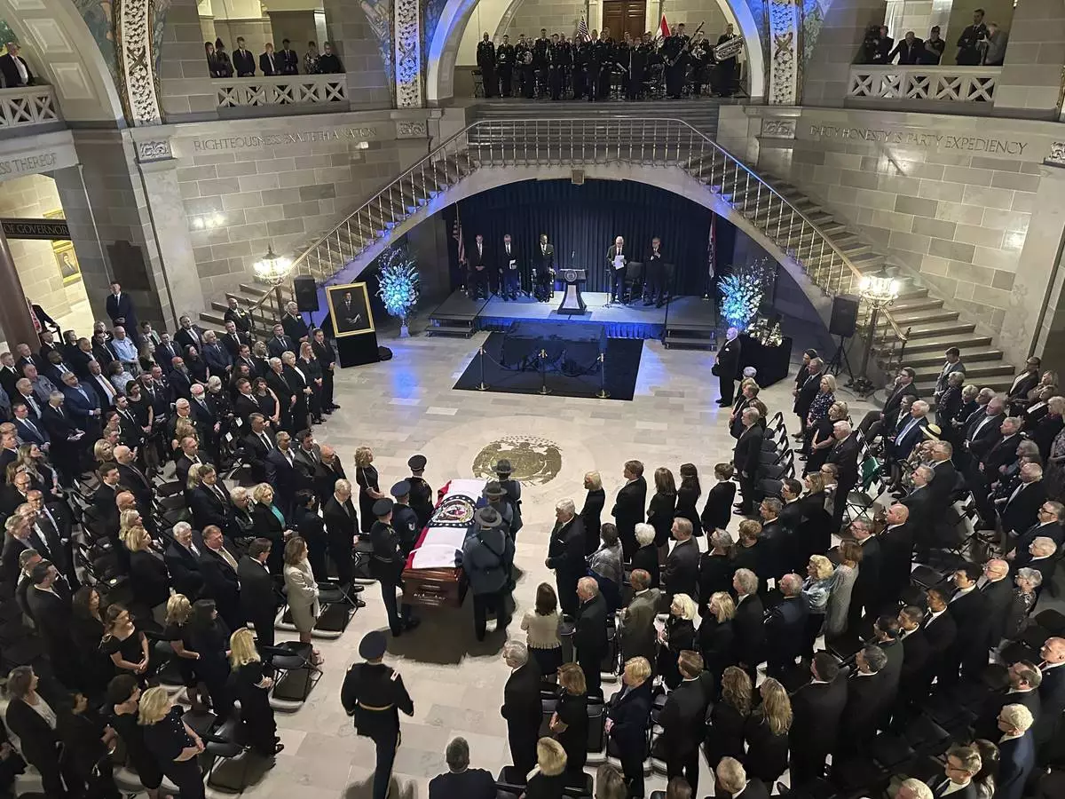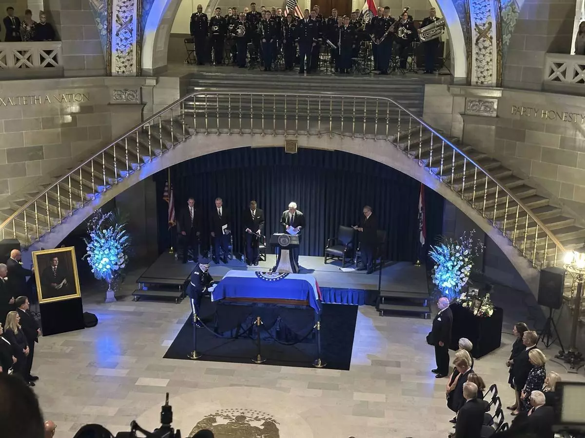 Missouri Gov. Mike Kehoe and first lady Claudia Kehoe pay their respects at a memorial service for former Missouri Gov. and U.S. Sen. Christopher Kit Bond at the state Capitol on Tuesday, May 20, 2025, in Jefferson City, Mo. (AP Photo/David A. Lieb)