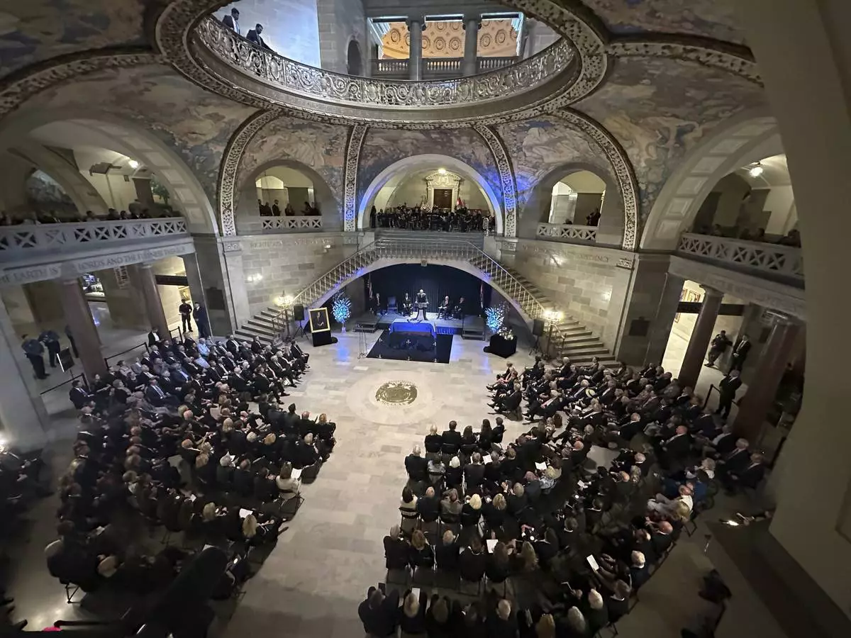Hundreds of people gather in the Missouri Capitol Rotunda for the memorial service of former Missouri Gov. and U.S. Sen. Christoper Kit Bond on Tuesday, May 20, 2025, in Jefferson City, Mo. (AP Photo/David A. Lieb)