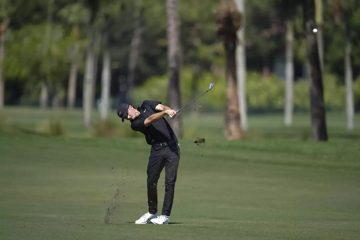 FILE - Rory McIlroy of Boston Common Golf watches a digital projection of his shot on the 13th hole during a match of the TMRW Golf League (TGL) against Jupiter Links Golf Club, Monday, Jan. 27, 2025, in Palm Beach Gardens, Fla. (AP Photo/Rebecca Blackwell, File)