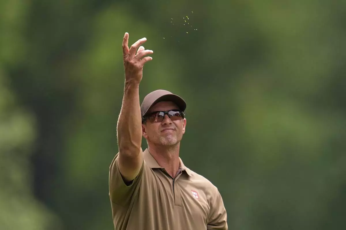 Adam Scott, of Australia, checks the wind on the second hole during the final round of the PGA Championship golf tournament at the Quail Hollow Club, Sunday, May 18, 2025, in Charlotte, N.C. (AP Photo/George Walker IV)