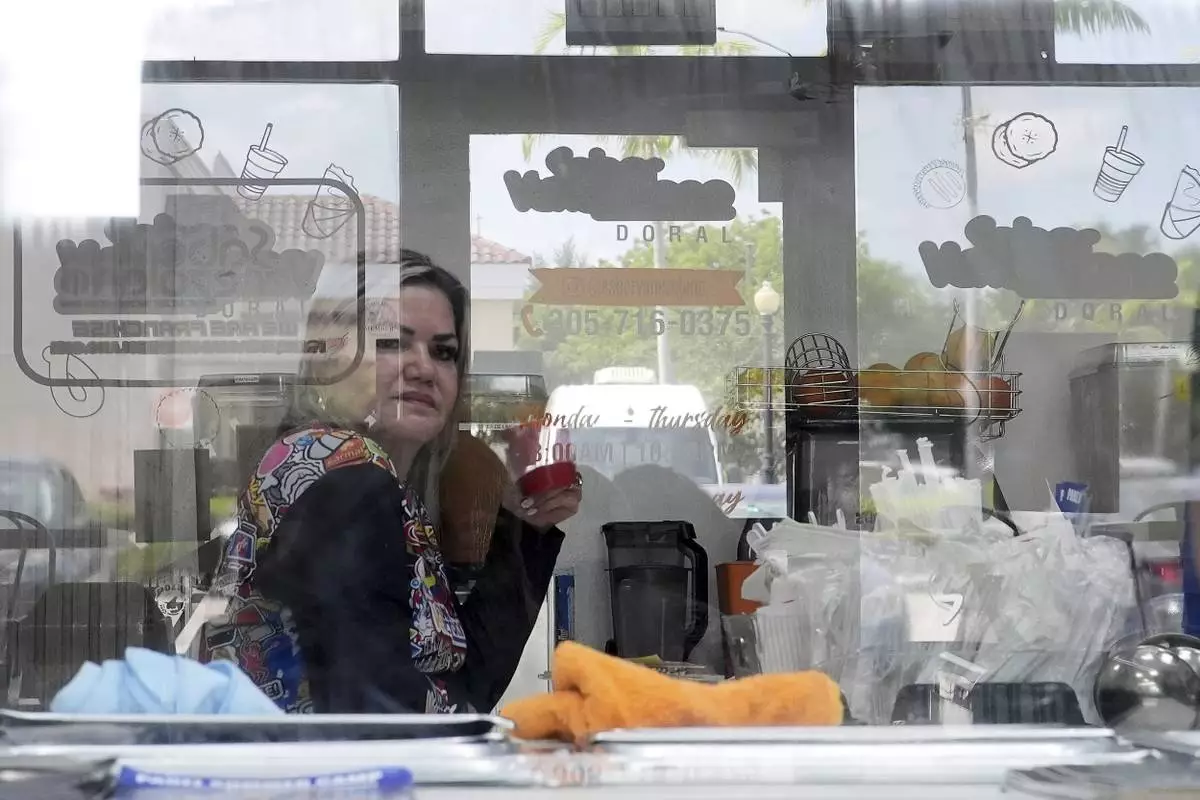 Manager Yrene Bruno is seen through reflective glass as she sits inside a franchise of "Sabor Venezolano," one of 18 businesses owned by Wilmer Escaray which employ scores of Venezuelan immigrants with Temporary Protected Status (TPS) who are now potentially exposed to deportation, in Doral, Fla., Tuesday, May 20, 2025. (AP Photo/Rebecca Blackwell) (AP Photo/Rebecca Blackwell)
