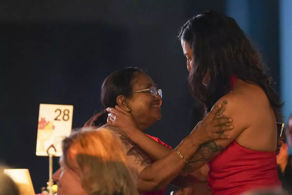 Banu Mushtaq, author of 'Heart Lamp', left, and Deepa Bhasthi react after winning the International Booker Prize, in London, Tuesday, May 20, 2025.(AP Photo/Alberto Pezzali)