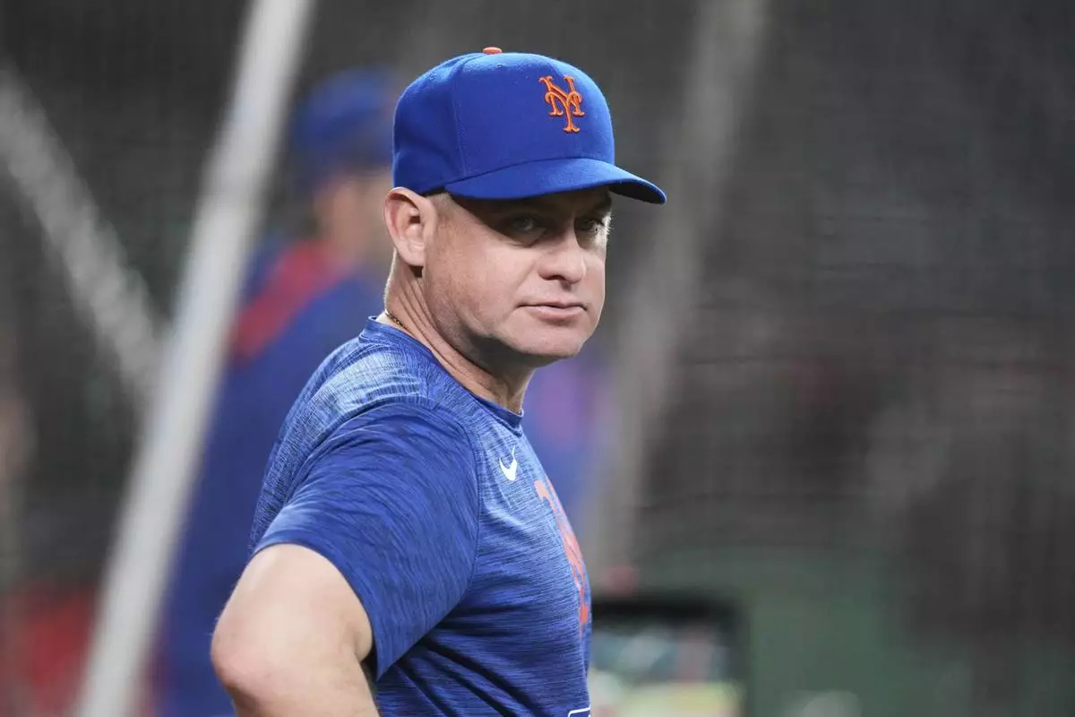 New York Mets manager Carlos Mendoza watches batting practice prior to a baseball game against the Arizona Diamondbacks Tuesday, May 6, 2025, in Phoenix. (AP Photo/Ross D. Franklin)