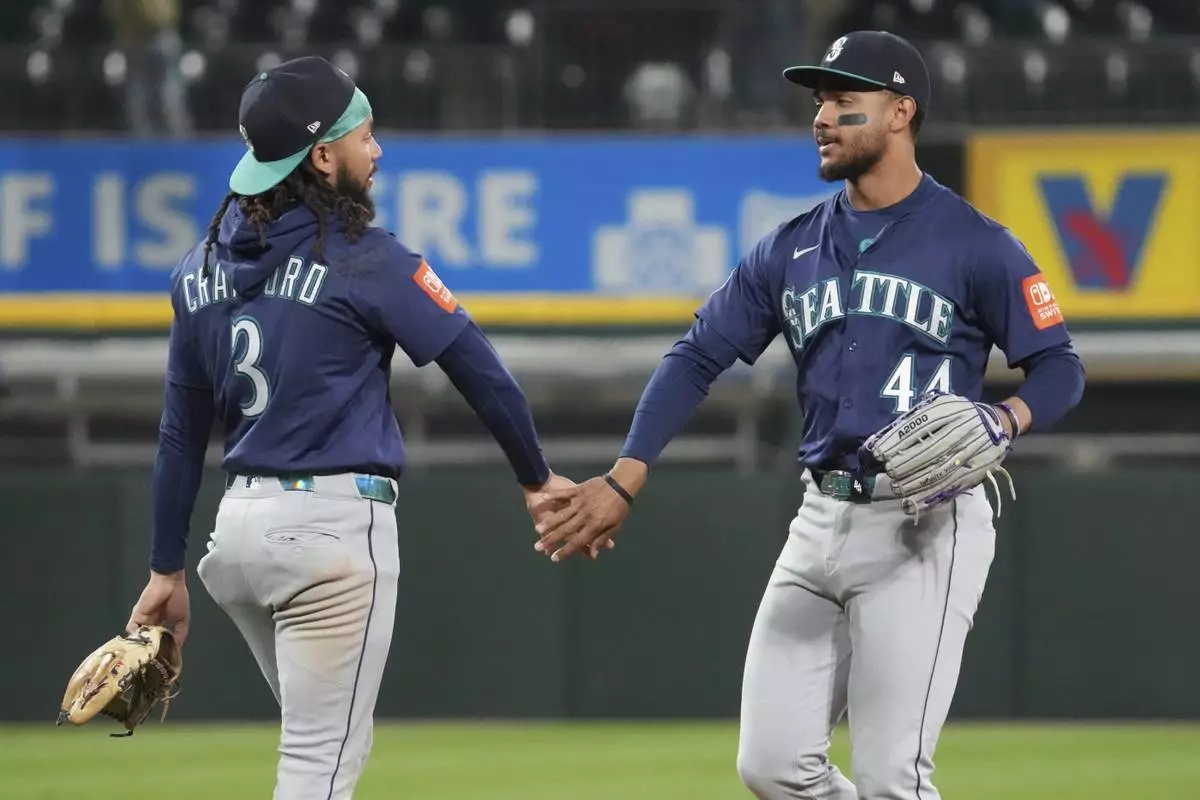 Seattle Mariners' J.P. Crawford, left, celebrates with Julio Rodríguez, right, after they defeated the Chicago White Sox in a baseball game in Chicago, Monday, May 19, 2025. (AP Photo/Nam Y. Huh)